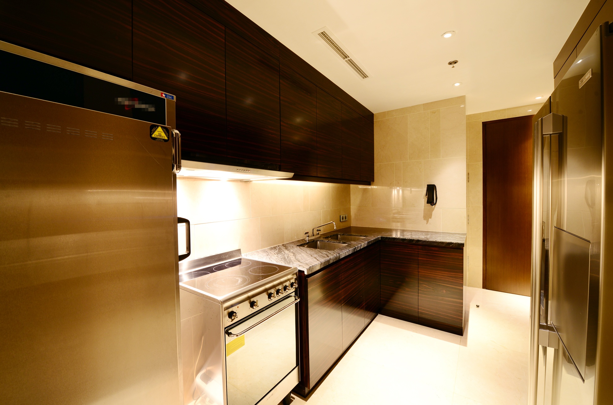 Phòng bếp với đầy đủ các thiết bị như tủ đá, tủ lạnh, máy rửa bát, ly chén... Căn phòng này cũng có cửa đi đặc biệt cho nhân viên phục vụ để đảm bảo quyền riêng tư.