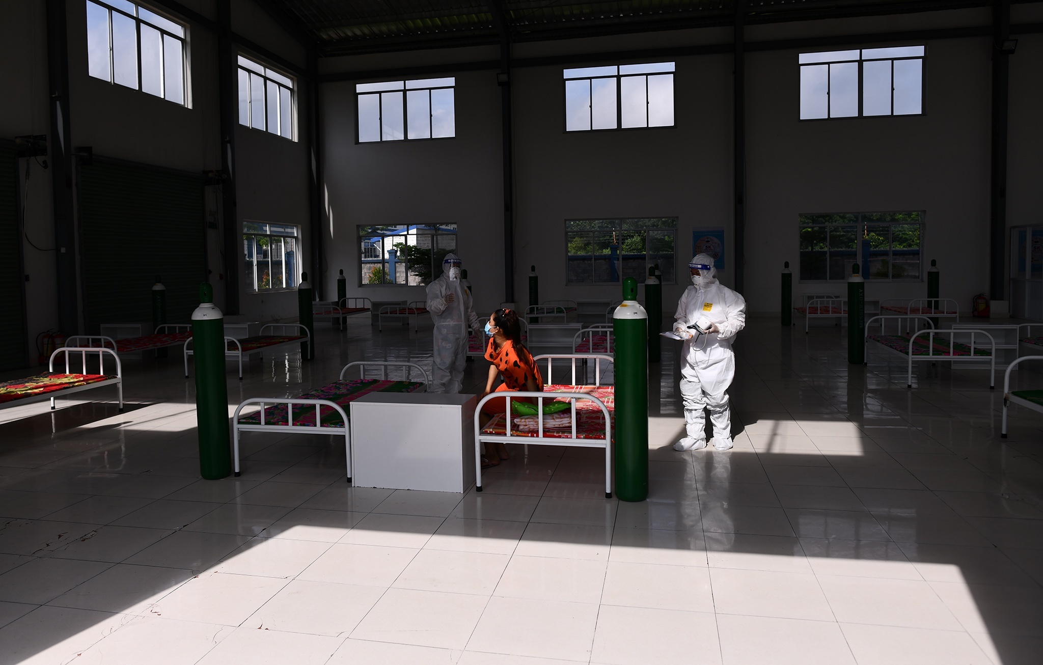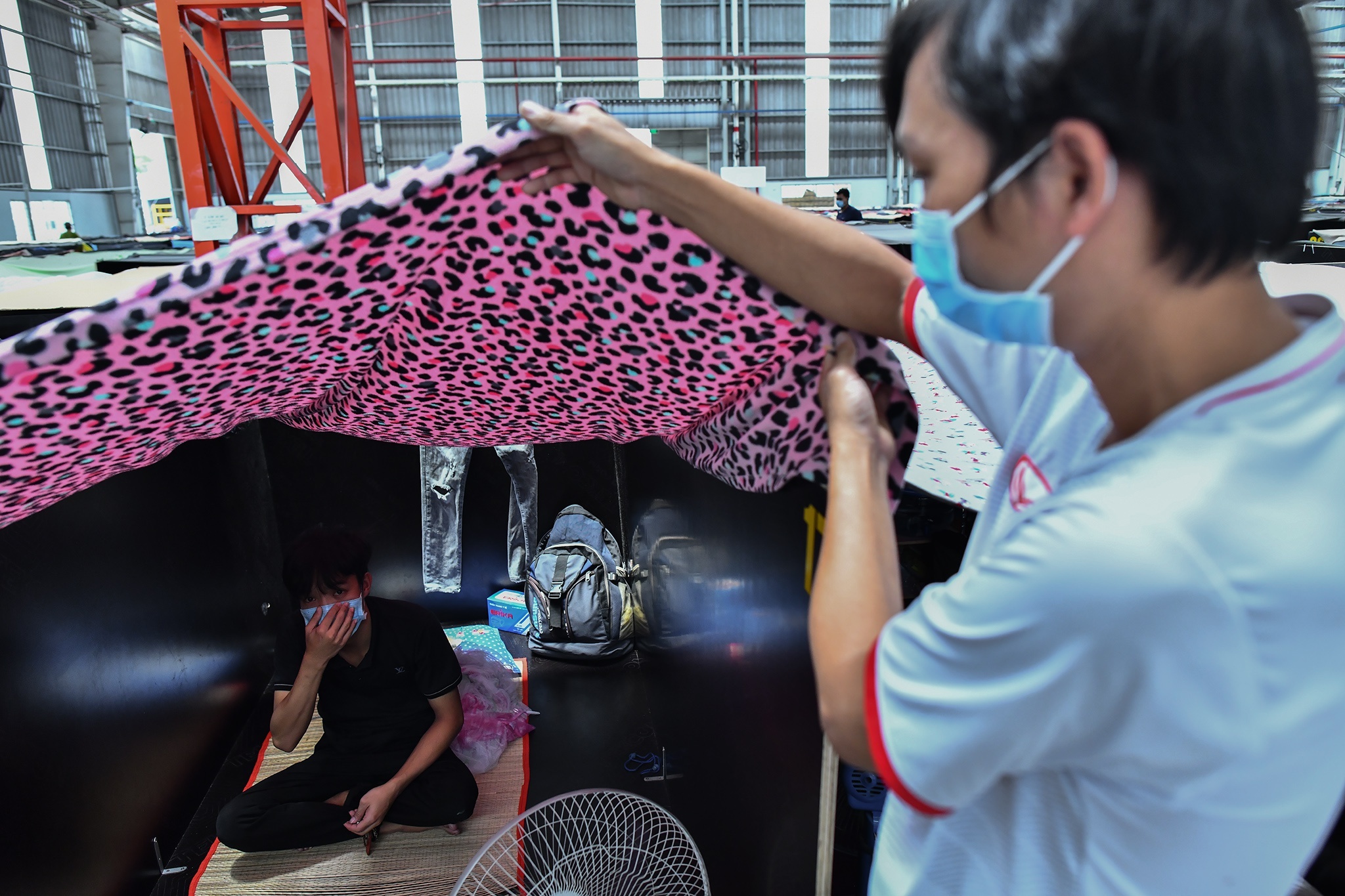 Một khu nhà xưởng rộng hàng trăm mét vuông được thiết kế thành hơn 1.000 phòng dã chiến. Mỗi phòng chỉ khoảng 3,5 m2, được ngăn cách với nhau bằng những tấm gỗ. Trong điều kiện dịch bệnh, việc bố trí chỗ ăn nghỉ cho hơn 1.000 công nhân trong nhà xưởng là áp lực lớn. Chưa kể những vấn đề phát sinh liên quan khác. Việc thực hiện “3 tại chỗ” được xem là giải pháp tình thế, gặp nhiều khó khăn. Ảnh: Phạm Ngôn.