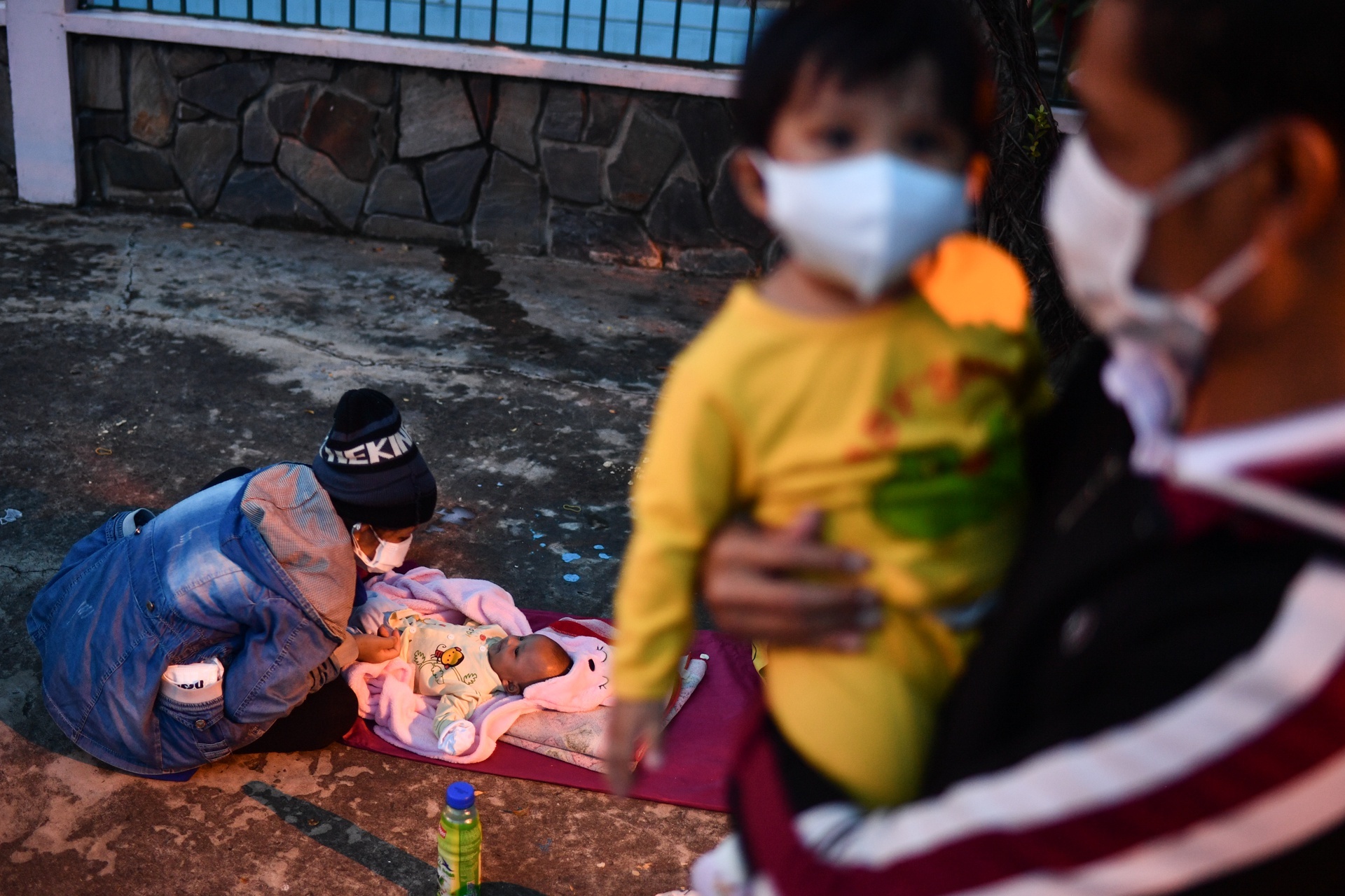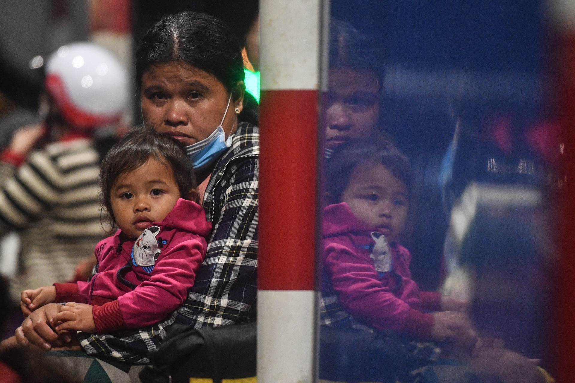 Giữa cơn mưa nặng hạt trên quốc lộ 1, cả đoàn dừng lại dưới một mái hiên. Người phụ nữ trẻ cởi vội chiếc áo mưa, ngồi xổm xuống dỗ đứa con mới hơn 2 tháng tuổi. Đứa trẻ khóc lớn rồi trớ ra toàn sữa. Đây là lần thứ 5 cả đoàn dừng lại để dỗ những đứa trẻ sau nhiều giờ di chuyển bằng xe máy. Phía trước họ là hành trình hàng trăm cây số để về quê. Ảnh: Duy Hiệu.