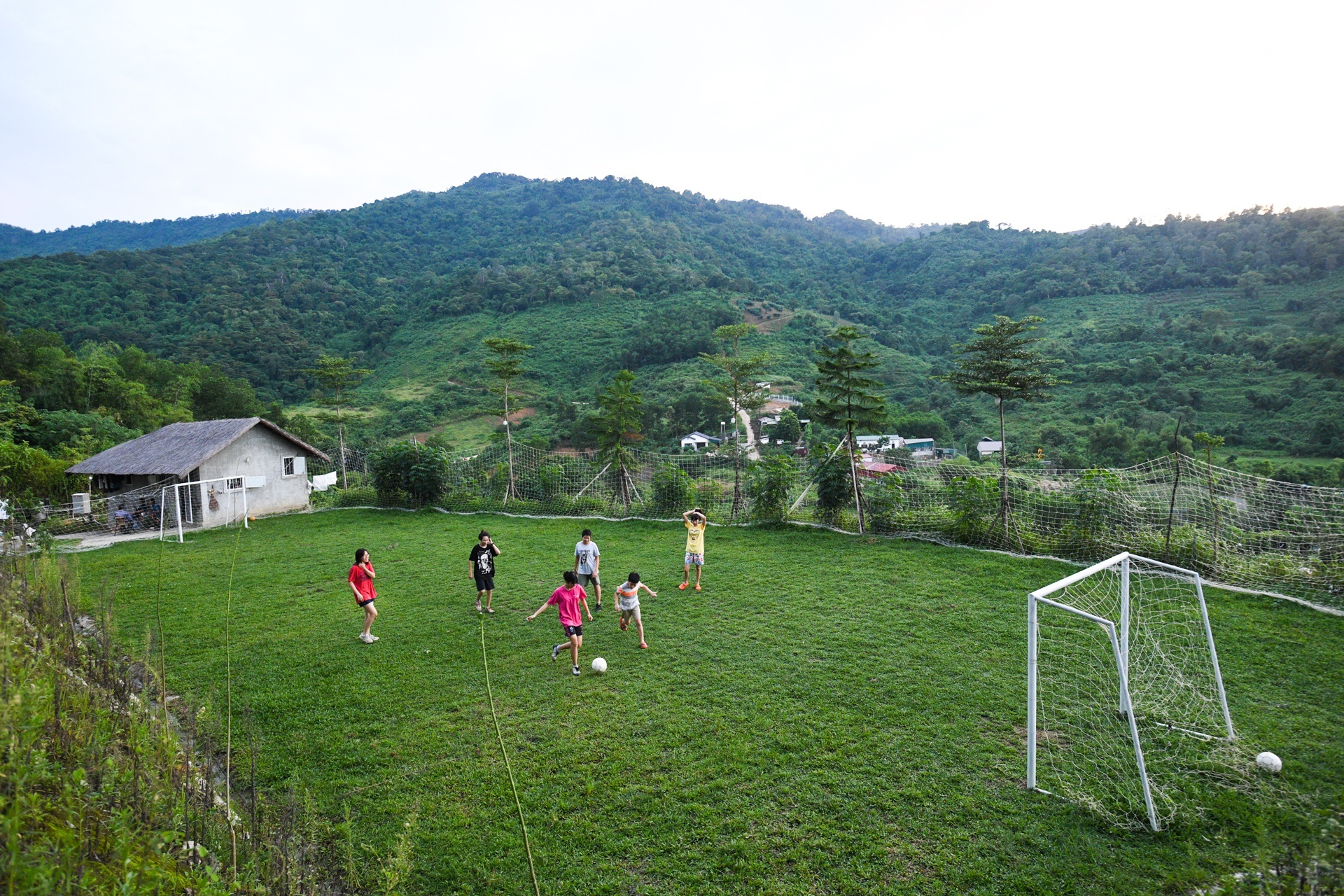 Theo bố mẹ rời nội thành về vùng ven thuộc huyện Quốc Oai ( Hà Nội) sinh sống, hơn nửa năm là quãng thời gian đủ để thế giới của hai cậu bé thay đổi hoàn toàn. Gấu (8 tuổi) bảo cậu sắp biến thành "người rừng" vì ngày nào cũng lên đồi, đi suối. Chiều chiều, những đứa trẻ được tự do nô đùa, chơi thể thao trên sân bóng với cỏ xanh rì cùng một không gian thoáng đãng. Ảnh: Thạch Thảo.