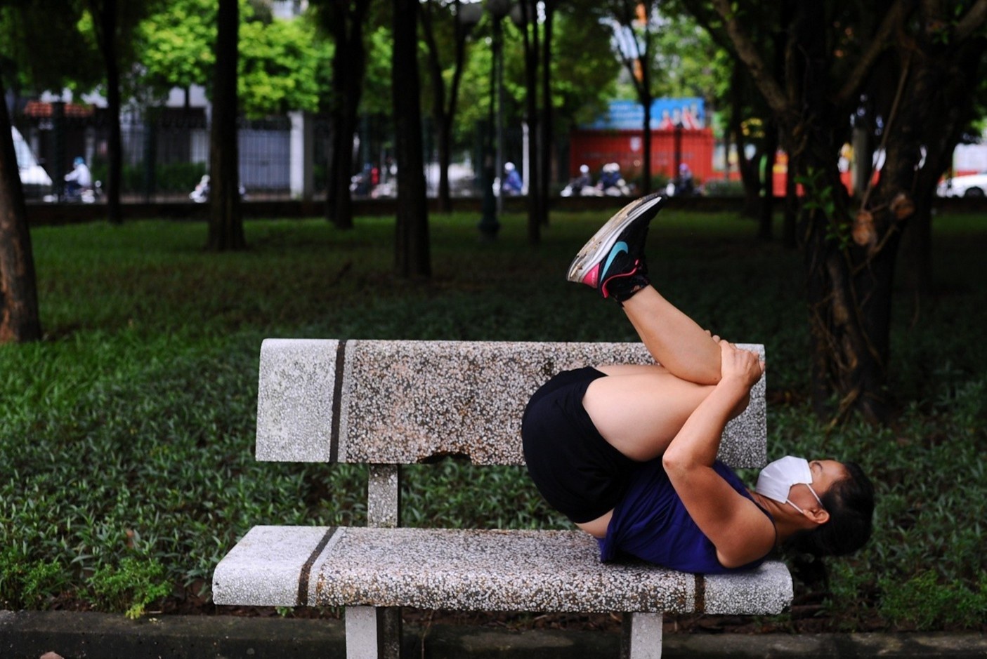 Bà Lợi (quận Cầu Giấy) tận dụng ghế đá để làm nơi tập thể dục sau nhiều tháng ở nhà. Các công viên tại Hà Nội đồng loạt mở trở lại sáng 14/10. Nhiều người không ngại mưa gió, có mặt từ sớm để luyện tập sau những ngày ở nhà phòng dịch. Ảnh: Thế Bằng.