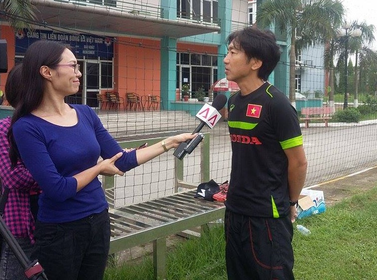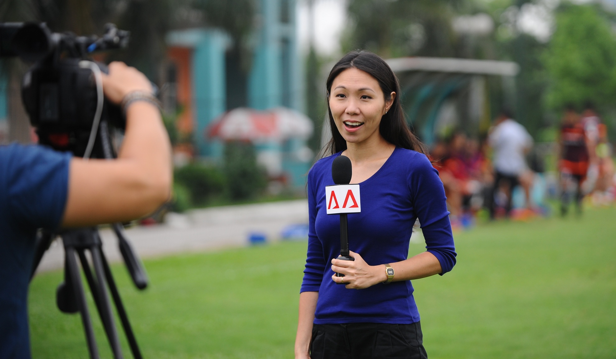 | Nữ phóng viên của kênh NewsAsia tác nghiệp trong buổi tập của U23 Việt Nam. |