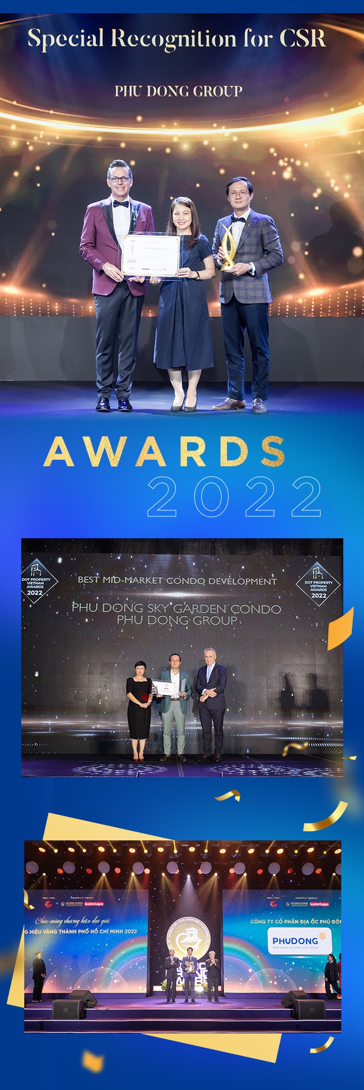 Cũng trong năm 2022, doanh nghiệp nhận được cú đúp giải thưởng: PropertyGuru Vietnam Property Awards 2022 - giải thưởng "Special Recognition for CSR”, hạng mục vinh danh doanh nghiệp thực hiện trách nhiệm xã hội và xây dựng cộng đồng tiêu biểu và Dot Property Vietnam Awards - giải thưởng “Căn hộ tầm trung tốt nhất - Best Mid-Market Condo Development” dành cho dự án Phú Đông Sky Garden.