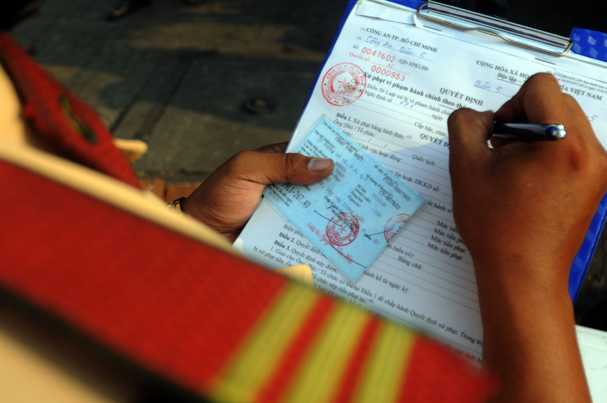 | Chị Bích Phương (ngụ quận 5) gọi điện thoại cho gia đình báo việc bị phạt vì chở con không đội nón bảo hiểm. Chị giải thích: "Biết quy định phải đội nón bảo hiểm cho con, nhưng hôm nay đi vội nên quên mang theo". |