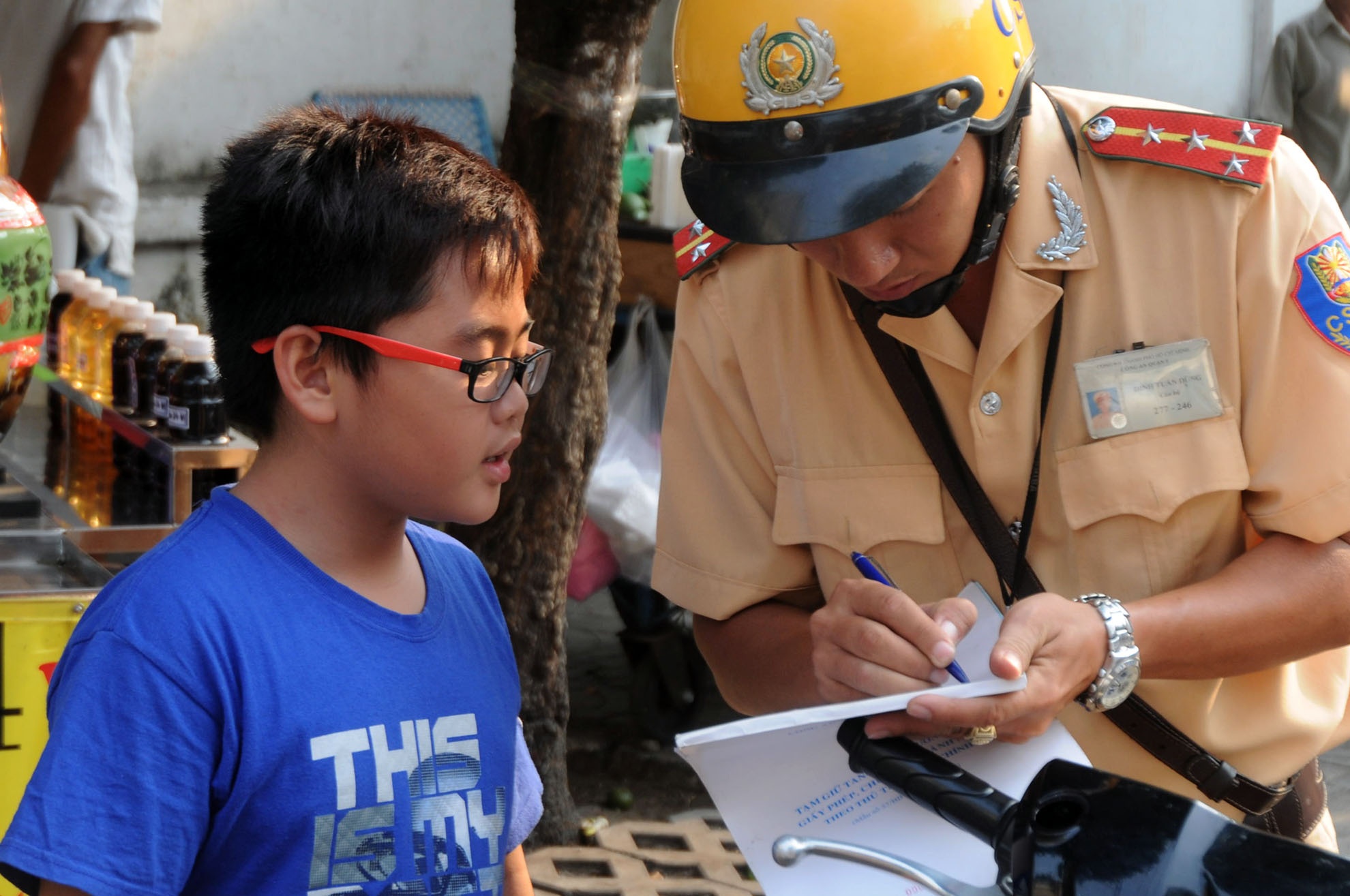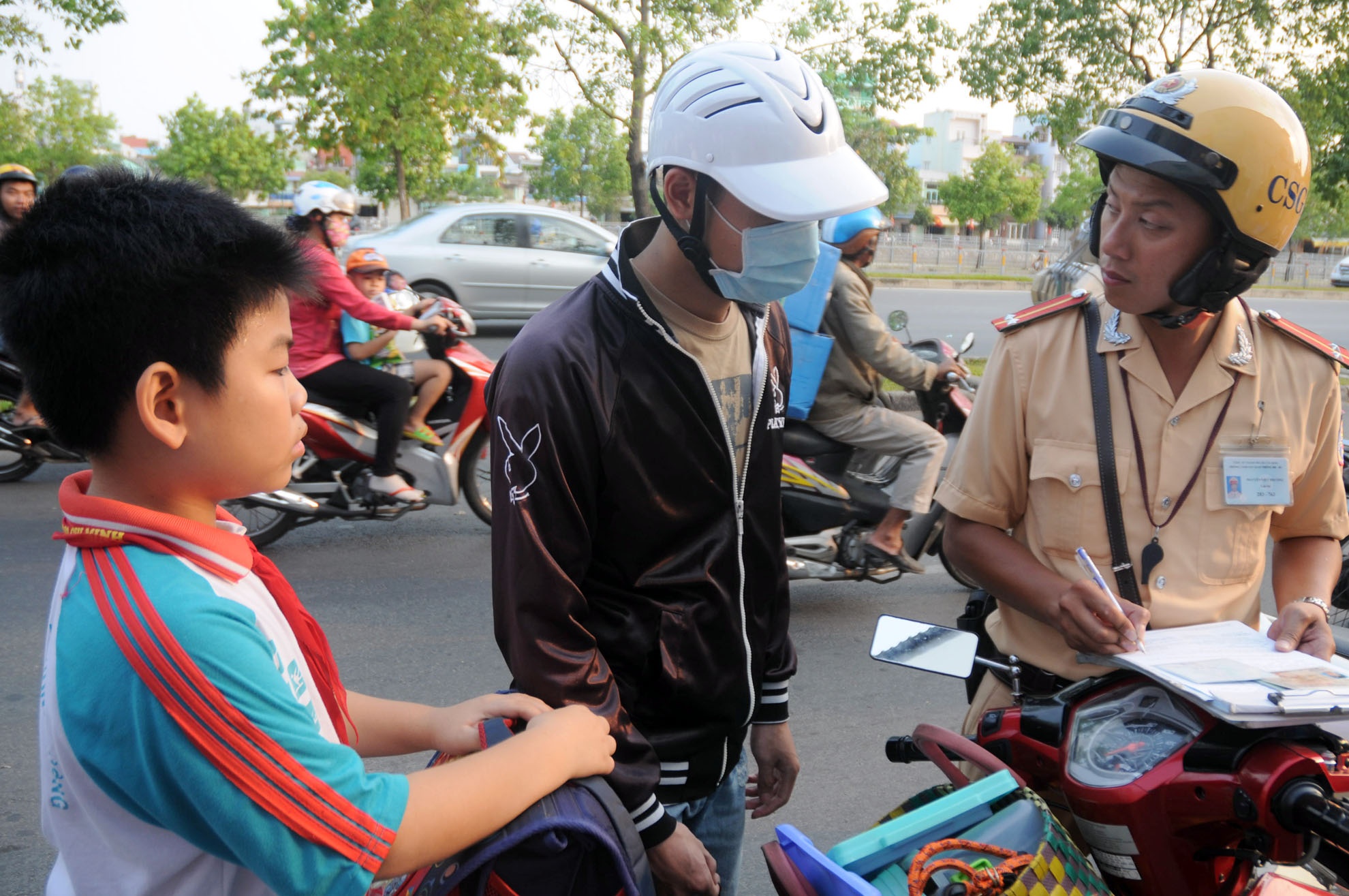 | Đa số các phụ huynh khi bị dừng xe đều thanh minh rằng đi vội quên mang nón, nhà ở gần trường. Có em nhỏ đã khóc mếu máo khi phụ huynh bị cảnh sát dừng xe để lập biên bản vi phạm. |