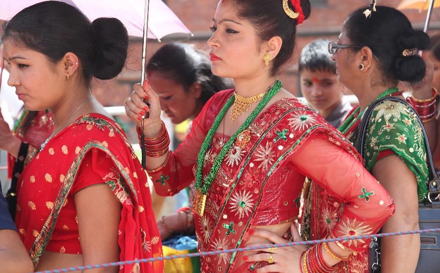 | Chị em theo đạo Hindu tại ngôi đền Pashupatinath (Nepal) trong dịp lễ hội Teej ngày 8/9. Lễ hội Teej ở Nepal năm nay diễn ra vào ngày 9/9. Teej là ngày của chị em phụ nữ theo đạo Hindu cầu nguyện và chúc phúc cho chồng. Ảnh: News.cn. |