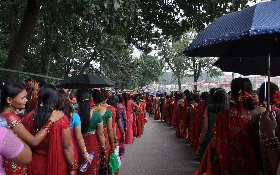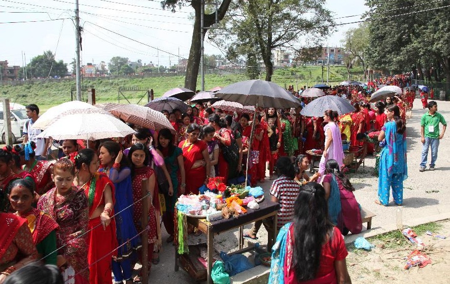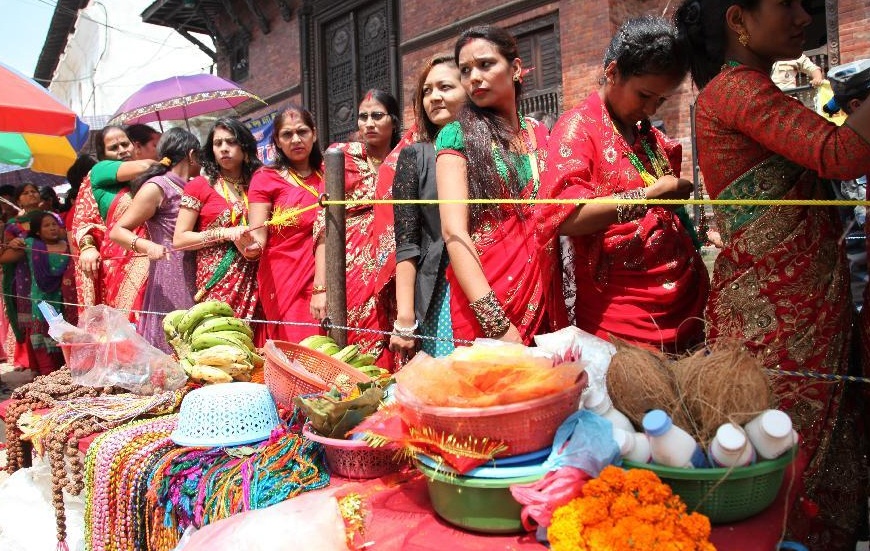 | Phụ nữ kéo nhau đến các ngôi đền thờ Thần Shiva, thần bảo hộ của đất nước. Họ cầu nguyện sức khỏe, may mắn và sự thịnh vượng cho đức lang quân của họ. Những người độc thân đến đền để cầu mong gặp ý trung nhân ưng ý. Ảnh: News.cn. |