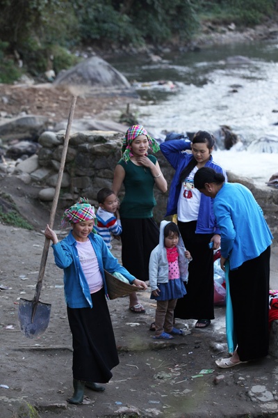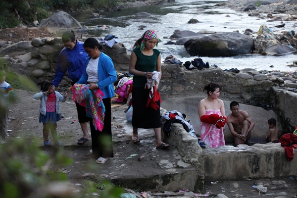 | Từ 4h chiều, người dân Tú Lệ lục tục kéo nhau ra suối Nặm Lung tắm nước nóng. Do bể nhỏ nên cứ chiều chiều hàng trăm người dân trong xã lần lượt đến tắm và kéo dài đến nửa đêm. |
