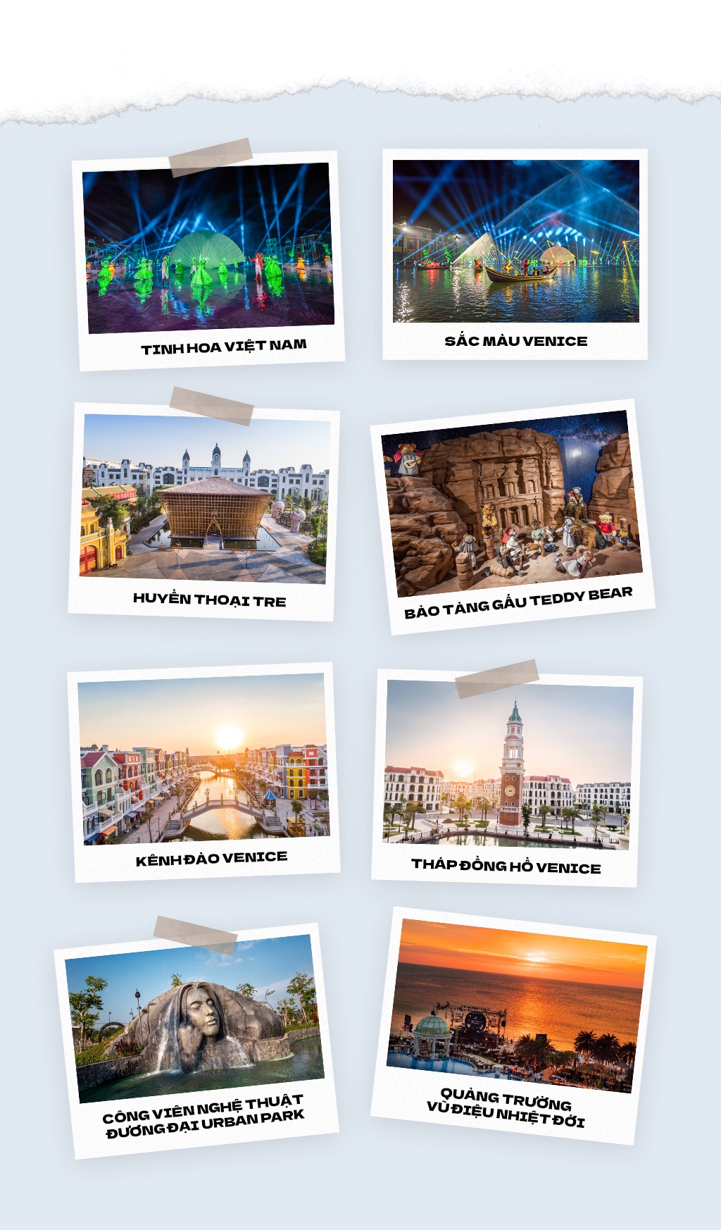 Đặc biệt, chỉ tại Grand World Phú Quốc - du khách mới có cơ hội thưởng lãm công nghệ giải trí đỉnh cao với show diễn thực cảnh đa phương tiện hoành tráng bậc nhất Tinh hoa Việt Nam; khám phá Huyền thoại Tre - Bamboo Legend lớn nhất nước làm từ 32.000 ngọn tre; tham quan bảo tàng gấu Teddy Bear - điểm đến thu hút hàng triệu du khách trẻ tuổi; chu du trên kênh đào mang màu sắc Venice diễm lệ; ngắm Tháp đồng hồ Venice cổ kính; thả mình vào Quảng trường biển rộng 19.500 m2 hay chiêm ngưỡng những tác phẩm nghệ thuật độc đáo tại Công viên nghệ thuật đương đại Urban Park…