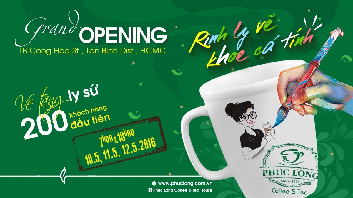Chương trình khai trương này có tên Rinh ly vẽ - Khoe cá tínhdành tặng 600 ly sứ cho khách hàng trong 3 ngày 10,11,12/5 tại cửa hàng Phúc Long Cộng Hòa. Mỗi ngày, 200 khách đầu tiên vào hai mốc thời gian 7h và 18h sẽ được nhận ly sứ. |