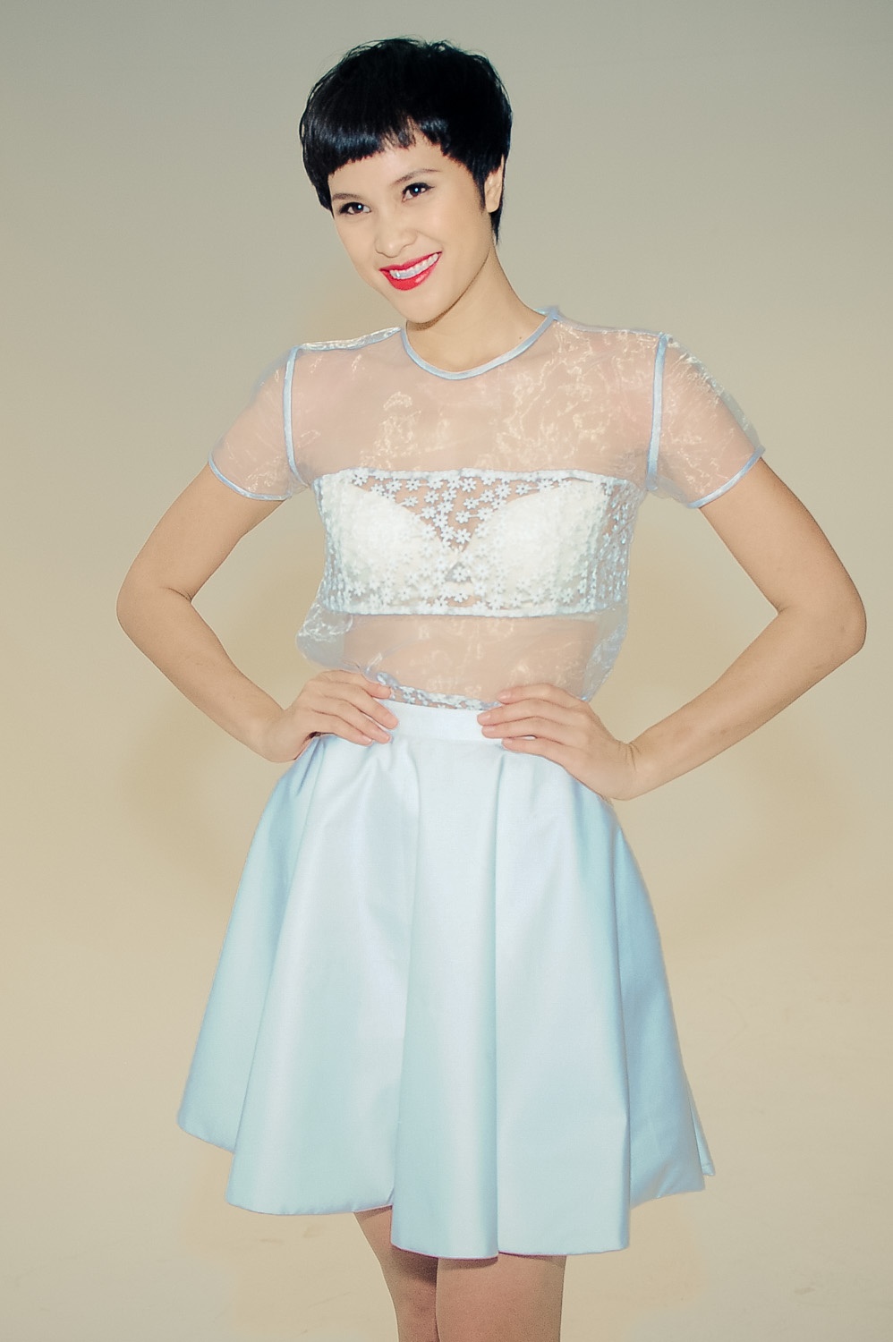 | Xuất hiện trong buổi chụp hình, Phương Mai diện bộ đầm màu xanh với phần thân trên trong suốt. |