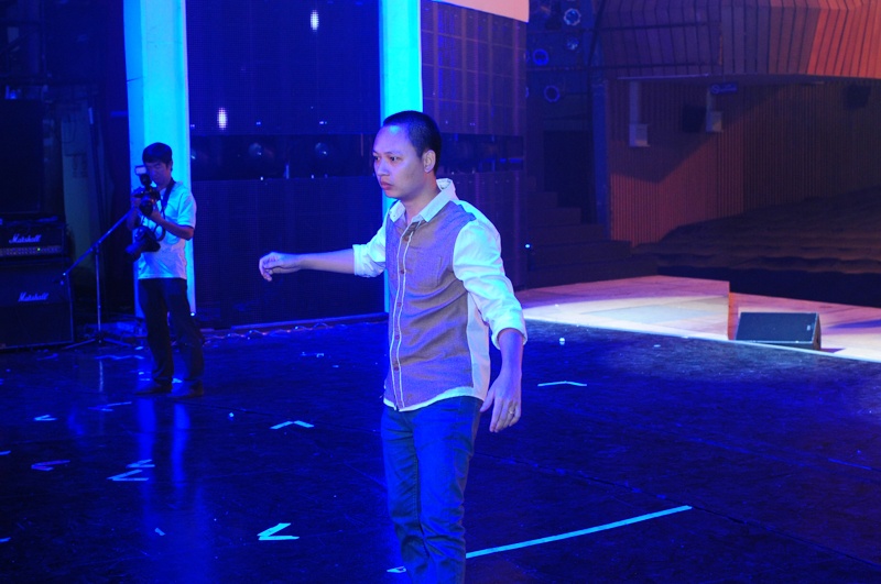 Karik cũng góp mặt trong tiết mục thú vị này. Năm nay anh đã "bước ra ngoài ánh sáng" nhờ các bài hát đình đám như Ế, Anh không đòi quà. Rapper nổi tiếng hài hước tập mệt nên ngồi bệt xuống sàn sân khấu. |