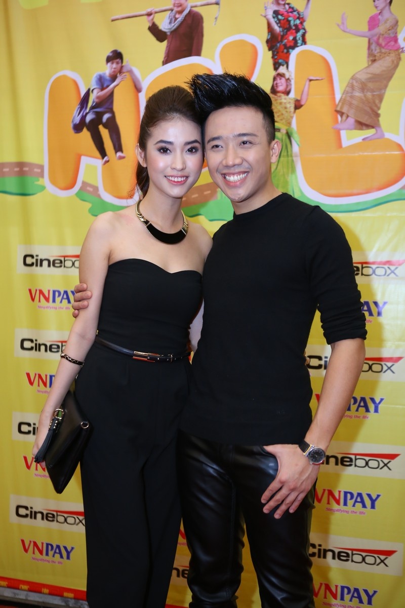 Trong buổi công chiếu đầu tiên, bạn gái Trấn Thành - Mai Hồ cũng có mặt để ủng hộ người yêu. Hot girl diện trang phục gợi cảm, tiệp tông đen cùng Trấn Thành.