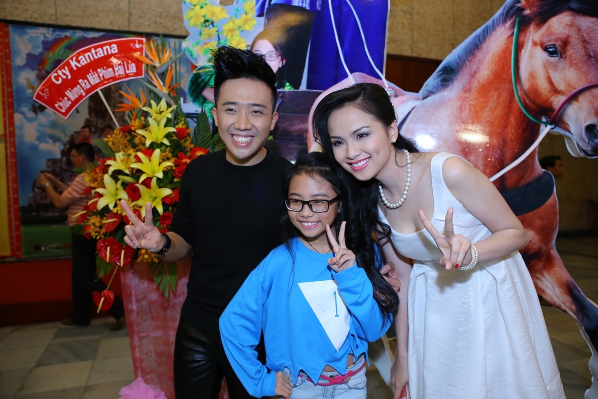 Phương Mỹ Chi cũng có mặt rất sớm để cùng chú Trấn Thành và hoa hậu Diễm Hương chụp ảnh cùng người hâm mộ và giới thiệu về vai diễn. Á quân The Voice Kids không chỉ đảm nhận vai trò ca sĩ thể hiện các ca khúc trong Hai Lúa, mà còn góp một vai diễn rất dễ thương ở gần cuối phim.