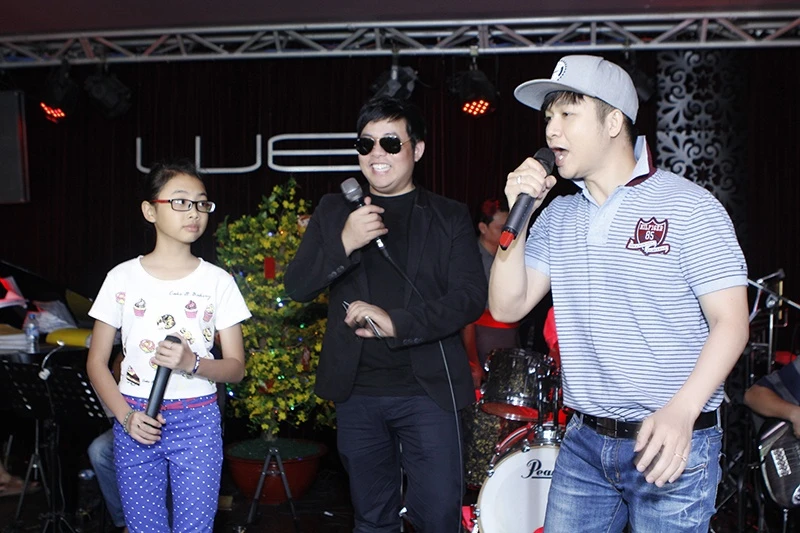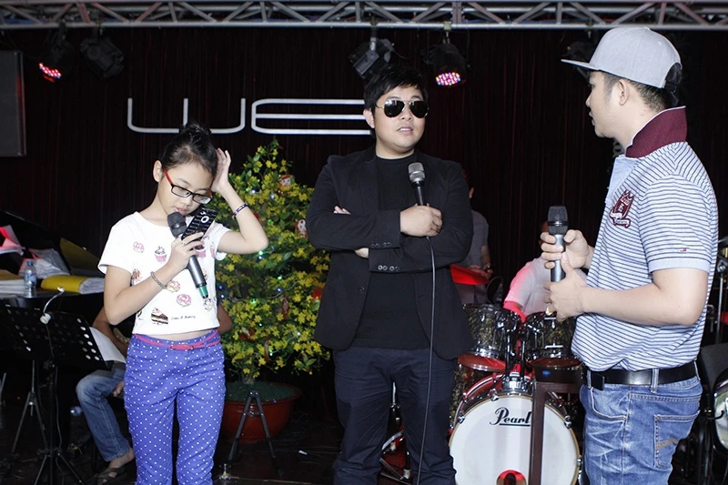 | Phương Mỹ Chi cũng góp mặt trong đêm nhạc của cha nuôi. Lần này, cô nhóc được thu xếp để hát tam ca cùng Quang Lê và Quách Tuấn Du. |