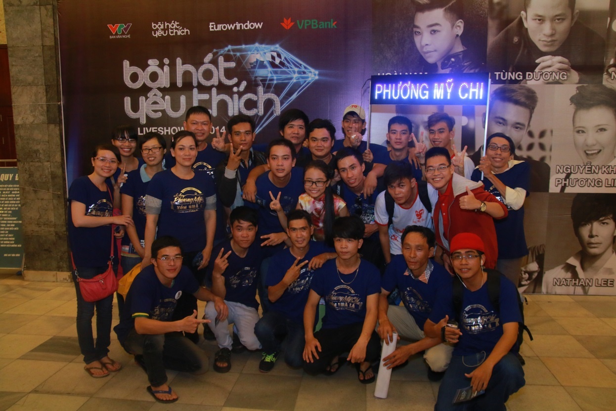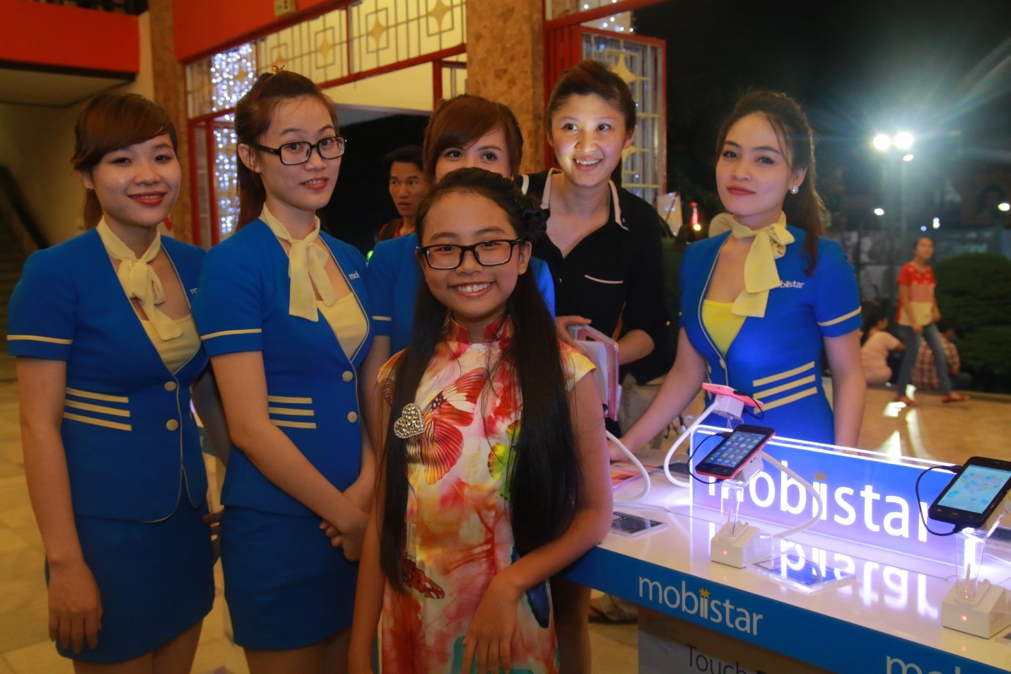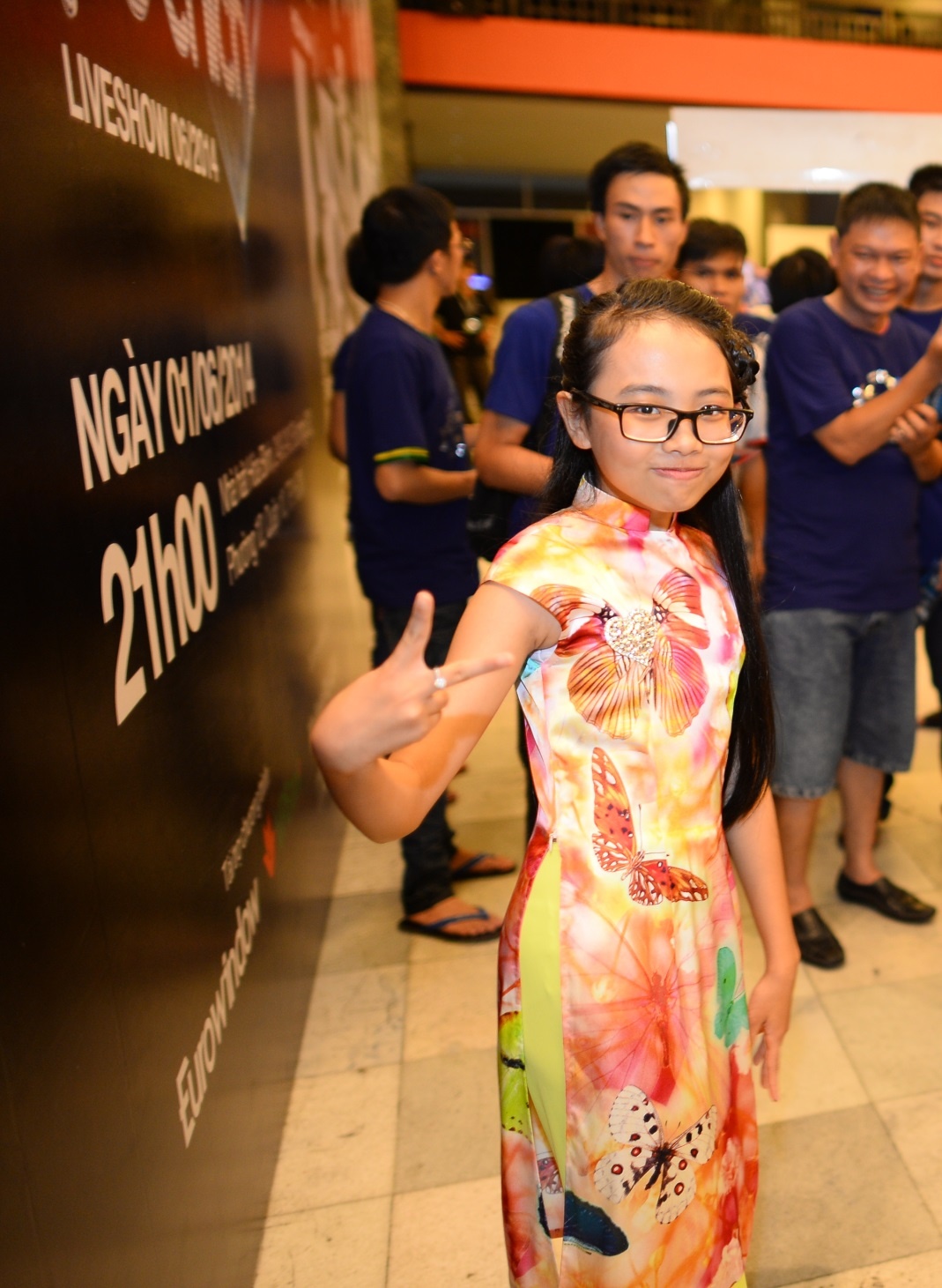 Phương Mỹ Chi xinh xắn trong trang phục áo dài cách điệu họa tiết bướm, đã có mặt rất sớm để giao lưu chụp ảnh cùng fan club. Đây là ca sĩ nhí có lực lượng fan hung hậu và nhiệt tình không thua gì các đàn anh đàn chị đi trước.