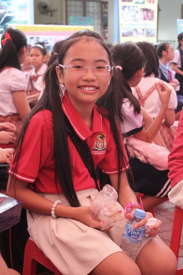 | Phương Mỹ Chi vui vẻ chụp hình với một số bạn cùng trường. |