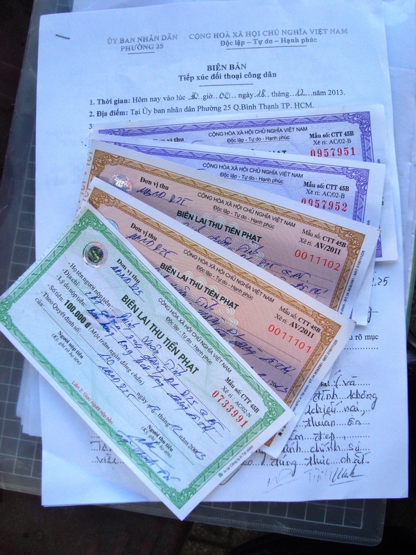 Ngoài ra, UBND P.25 đã lập 5 biên bản xử phạt tổng cộng số tiền 150 ngàn đồng đối với anh Tình về việc anh này vi phạm là “bán hàng rong trên lòng đường đô thị”. Anh Tình chấp thuận và tiến hành nộp phạt hành chính theo quy định. Đồng thời, anh này cũng có cam kết, không khiếu nại, tố cáo gì về sau.