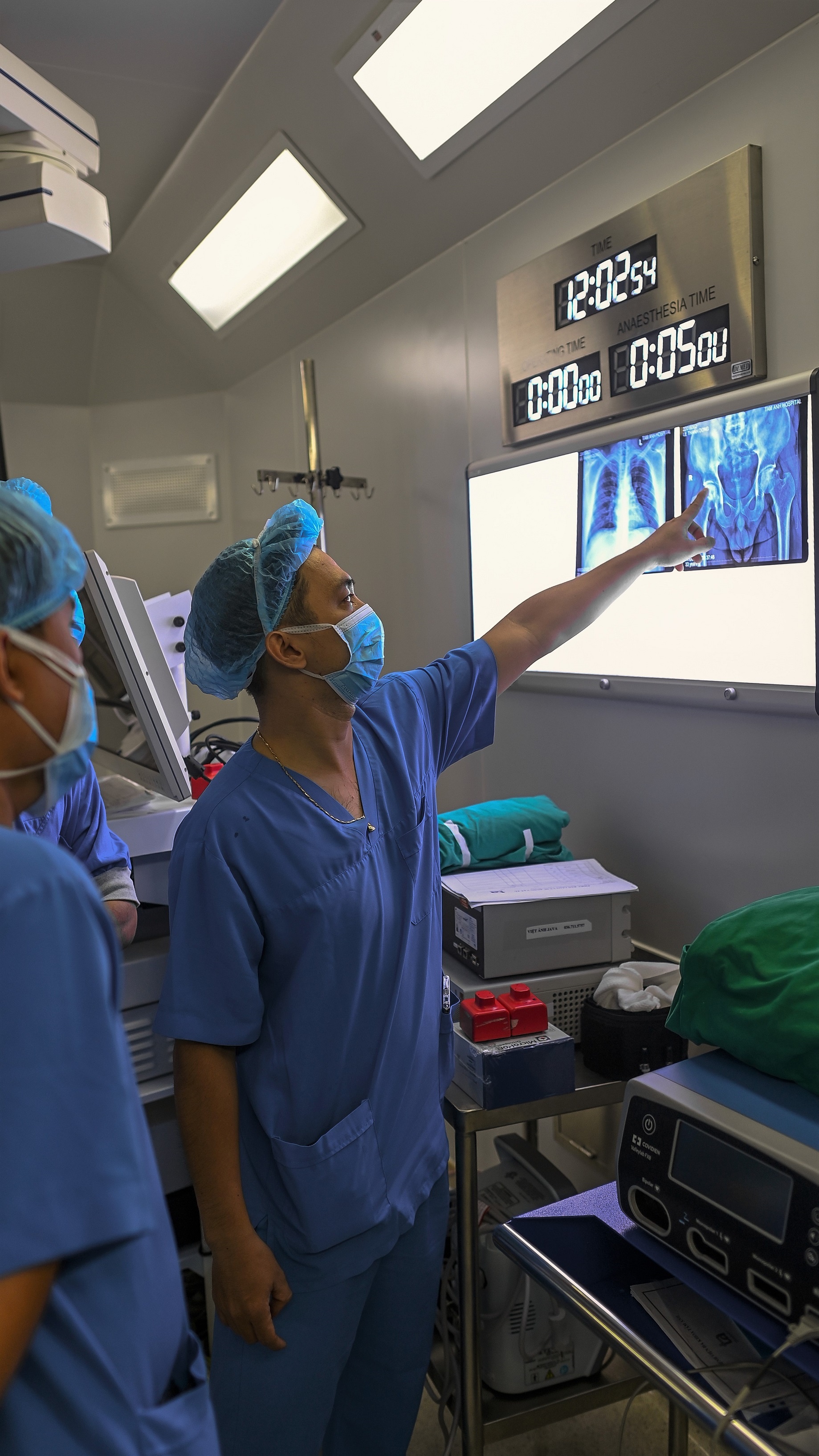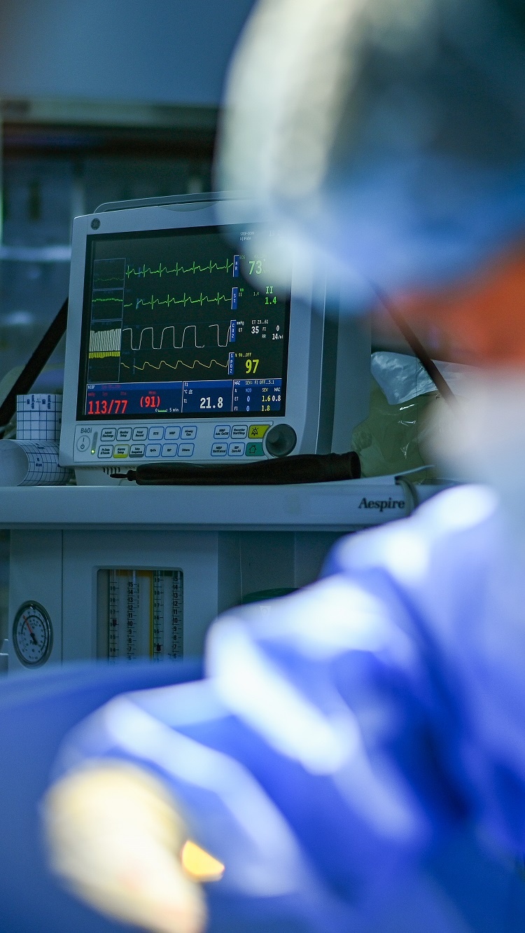 | Mọi chỉ số sinh tồn trong quá trình thực hiện ca phẫu thuật như nhịp tim, nhịp thở, nhiệt độ, huyết áp, bão hoà oxy máu... được nhóm điều dưỡng theo dõi liên tục. Trong mỗi ca phẫu thuật thay khớp SuperPath, không chỉ có các bác sĩ Ngoại Chấn thương chỉnh hình mà bác sĩ Nội tim mạch, bác sĩ Gây mê hồi sức… cũng túc trực để luôn sẵn sàng trước mọi tình huống có thể xảy ra. |