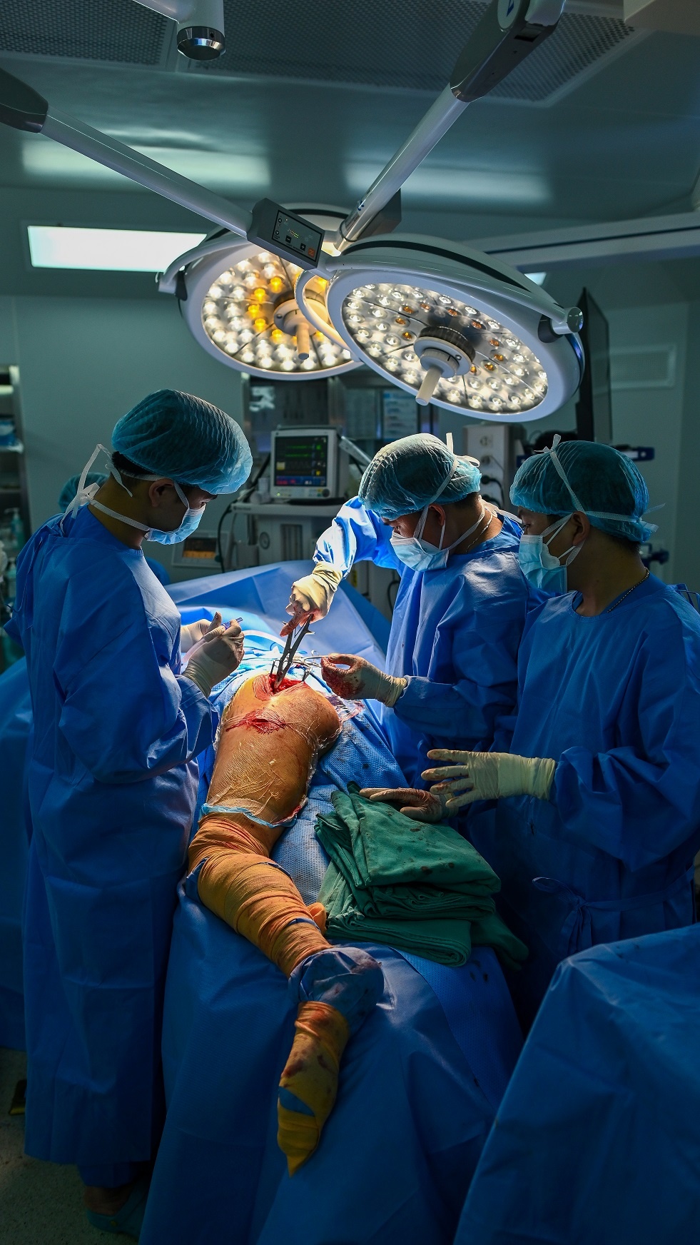 | Chúng tôi thống nhất thực hiện đường mổ chân trái trước, do khu vực khớp háng bên trái có dấu hiệu tổn thương nặng nề hơn. |