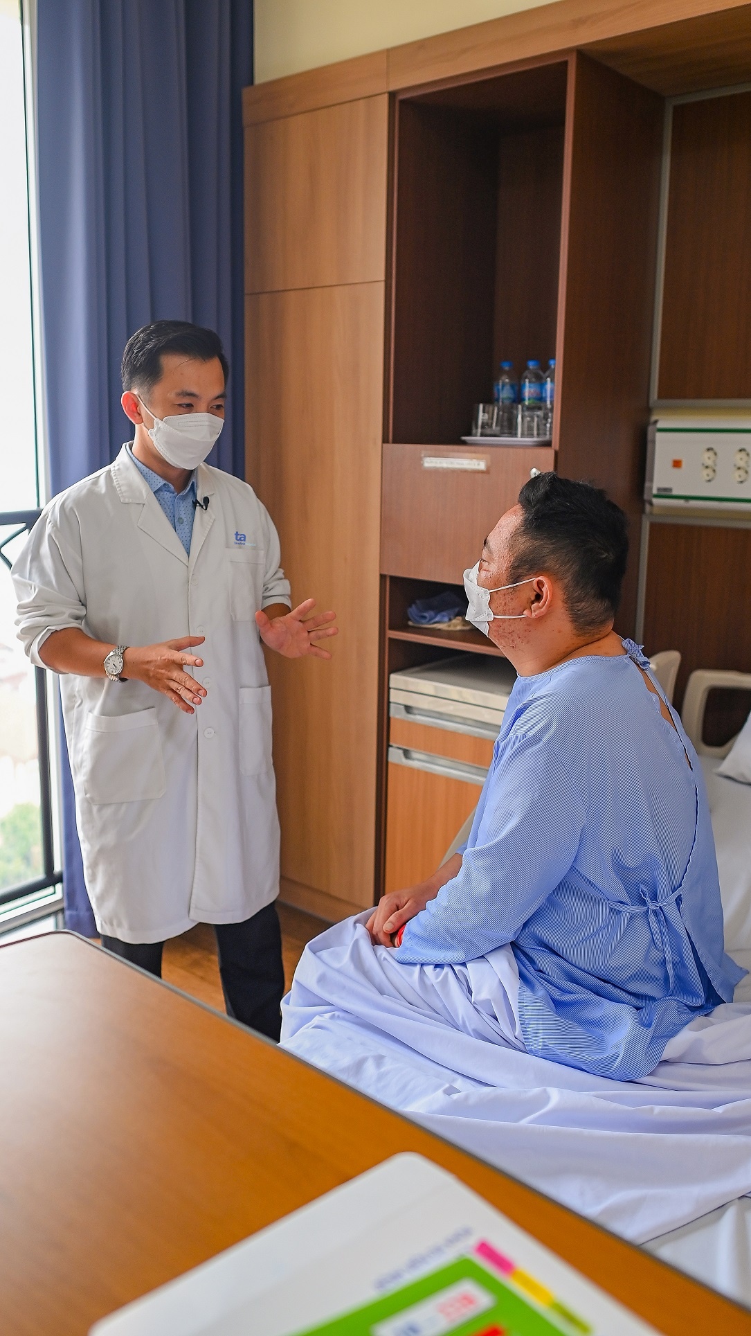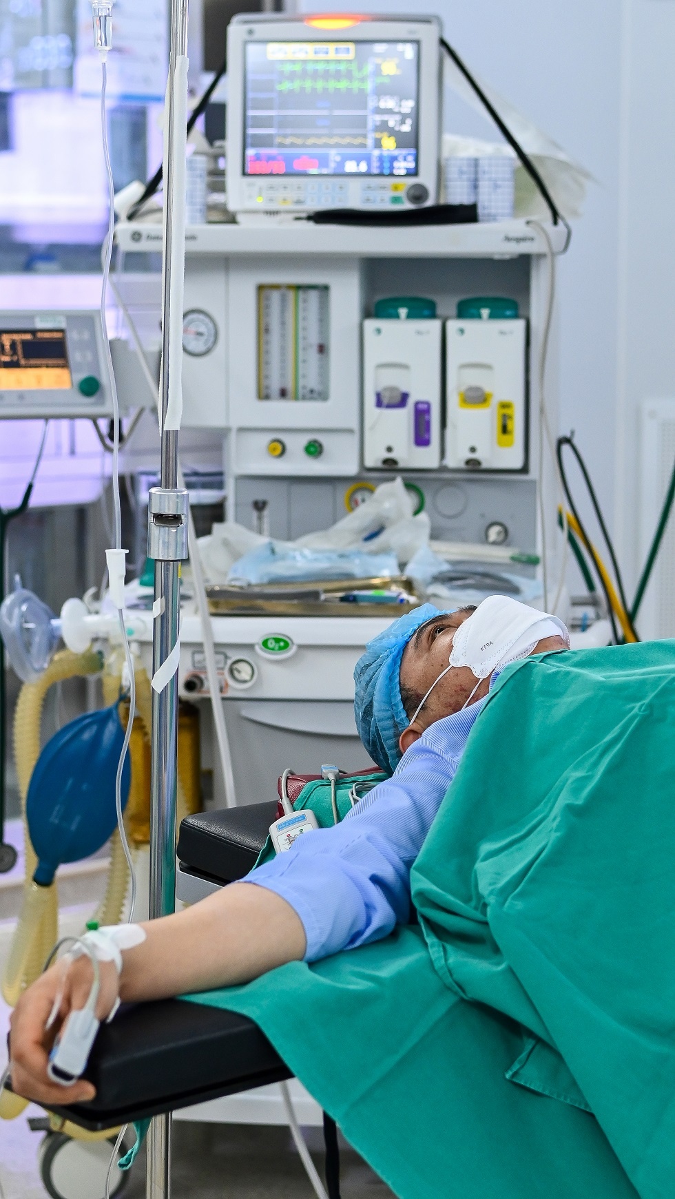 | Sau khi được bác sĩ tư vấn, người bệnh có thể lựa chọn phương pháp gây mê hoặc gây tê. Người bệnh được thay quần áo mổ. "Quan trọng nhất là giữ tâm lý thoải mái. Ca mổ sẽ kéo dài trong khoảng 2 giờ thôi" - điều dưỡng viên liên tục trấn an người bệnh trước khi làm thủ tục gây mê. |