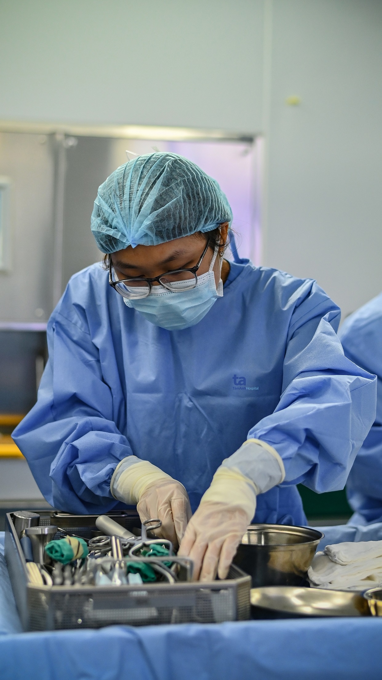 | Theo phân công và kế hoạch, các điều dưỡng đã chuẩn bị đầy đủ dụng cụ cho ca mổ, đồng thời sắp xếp chúng gọn gàng theo tiến trình của một cuộc phẫu thuật thường quy. Với phẫu thuật thay khớp háng, phẫu thuật viên sẽ sử dụng tới hơn 100 dụng cụ lớn nhỏ, gồm: Dao mổ, kéo mổ, kẹp phẫu tích, kìm cầm máu, chỉ, kim, kìm kẹp kim, bộ khoan, búa, đục phẫu thuật… |