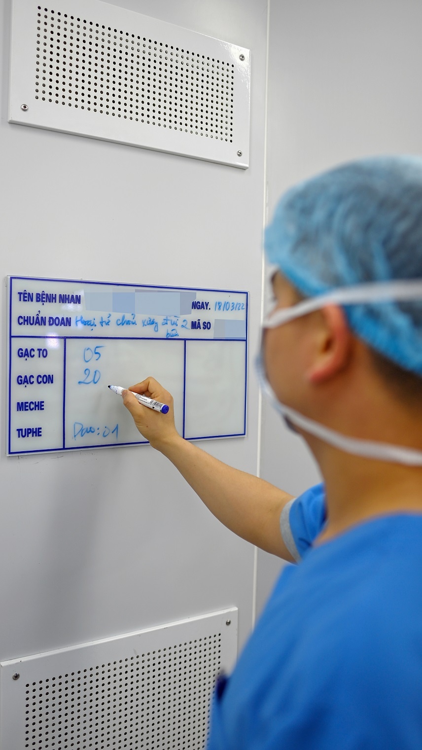 | Tất cả thông tin cơ bản của bệnh nhân như tên, tuổi, số lượng dụng cụ và gạc được nhóm điều dưỡng kiểm đếm, ghi chú cẩn thận trên một tấm bảng trong phòng mổ để tiện theo dõi đối chiếu trước và sau ca phẫu thuật. |