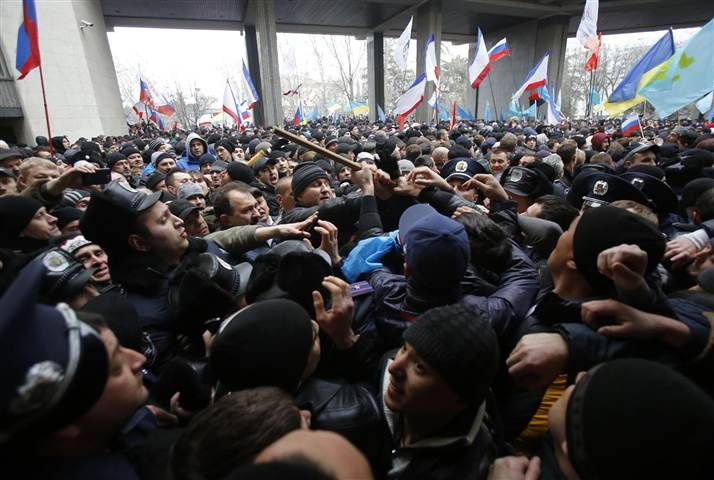 | Một cuộc đụng độ giữa những người biểu tình ủng hộ và chống Nga trên bán đảo Crimea vào tháng 2. Ảnh: AP |