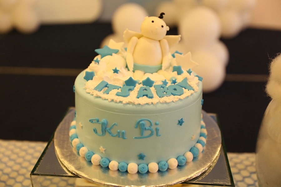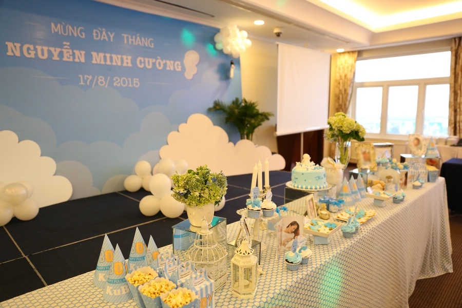 | Kiện tướng khiêu vũ chọn xanh, trắng là gam màu chủ đạo trong tiệc đầy tháng bé Kubi. |