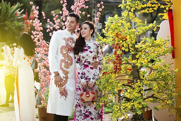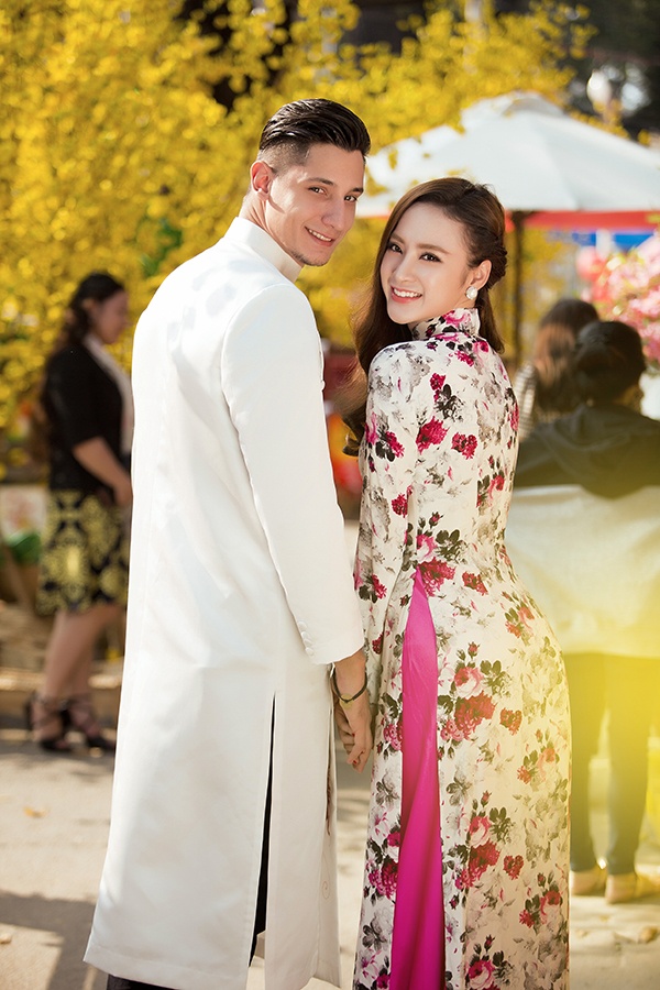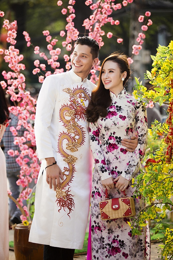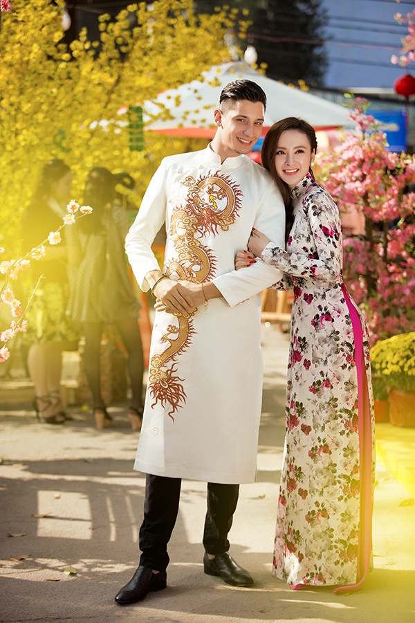 | Khác với hình ảnh sexy, gợi cảm như mọi khi, nhân dịp năm mới, Angela Phương Trinh diện áo dài họa tiết hoa trẻ trung du xuân, cầu nguyện một năm nhiều may mắn. Trong khi đó, bạn nhảy của cô tại Bước nhảy hoàn vũ 2015 - Kris thích thú khi được khoác lên người chiếc áo dài truyền thống họa tiết rồng. |