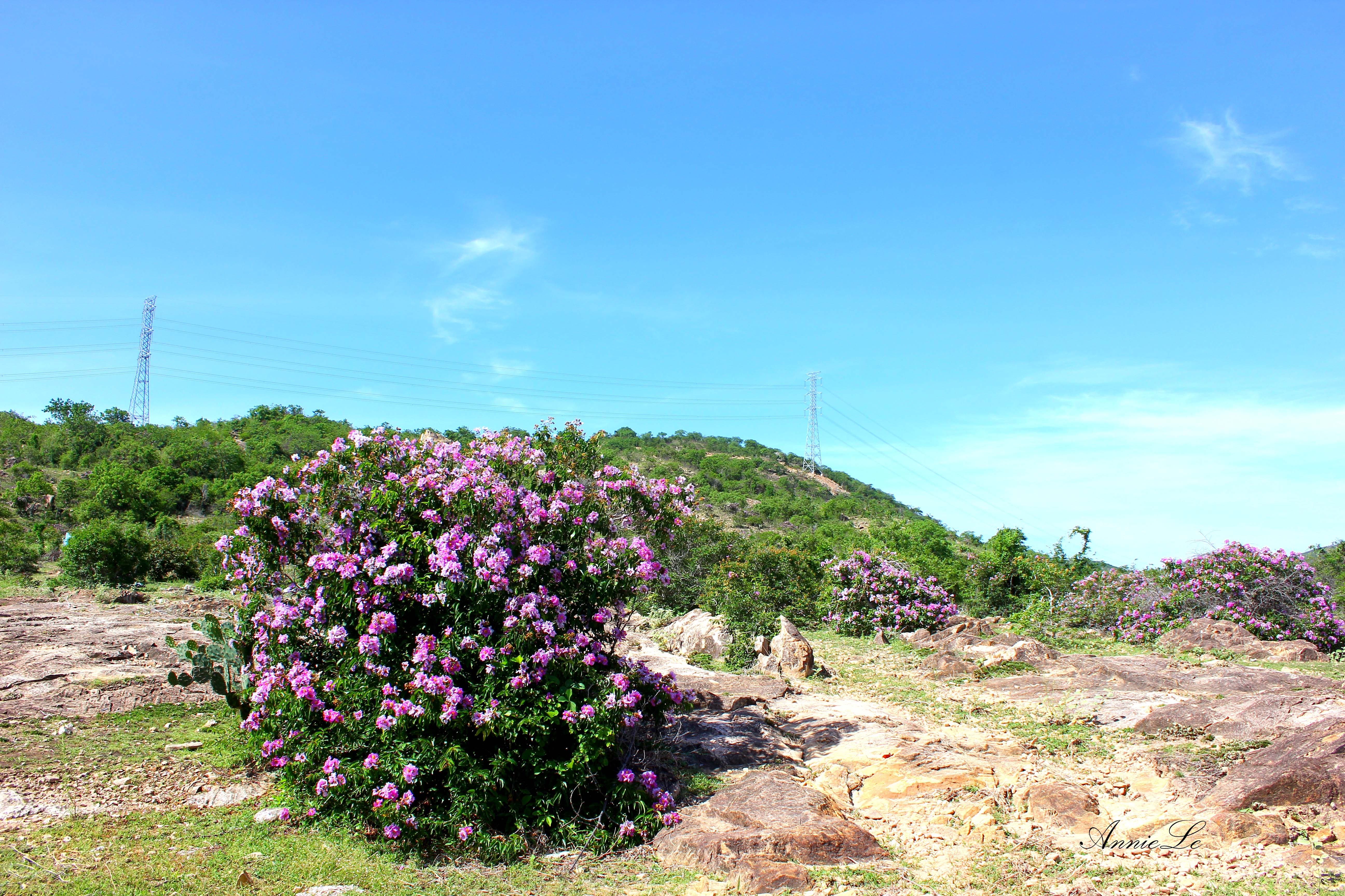 Thời điểm thứ hai là tháng 7, tháng 8 dương lịch. Lúc này, Tuy Phong đã đón một lượng mưa tương đối nhiều, bạn sẽ bắt gặp những vườn nho trĩu quả, đồng cỏ xanh mát, và đặc biệt là bằng lăng rừng nở tím những ngọn đồi Phan Dũng.