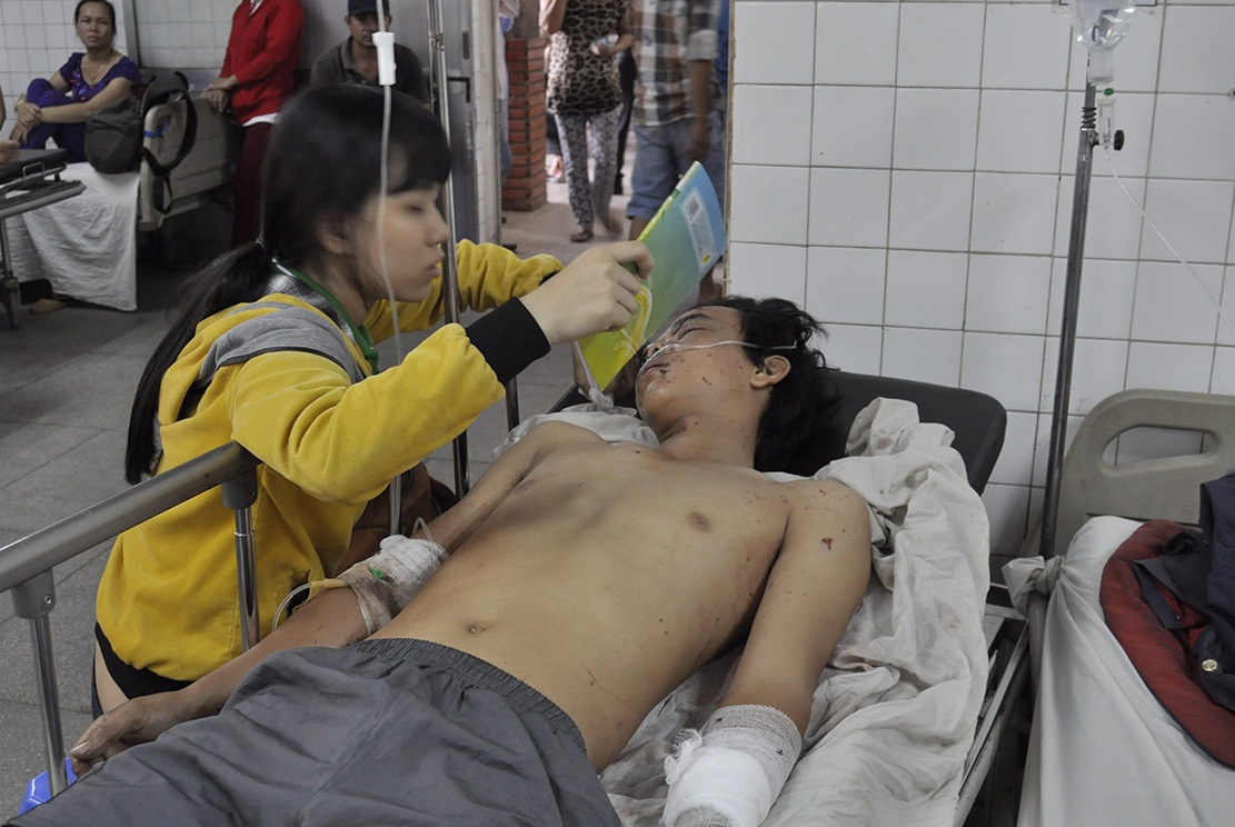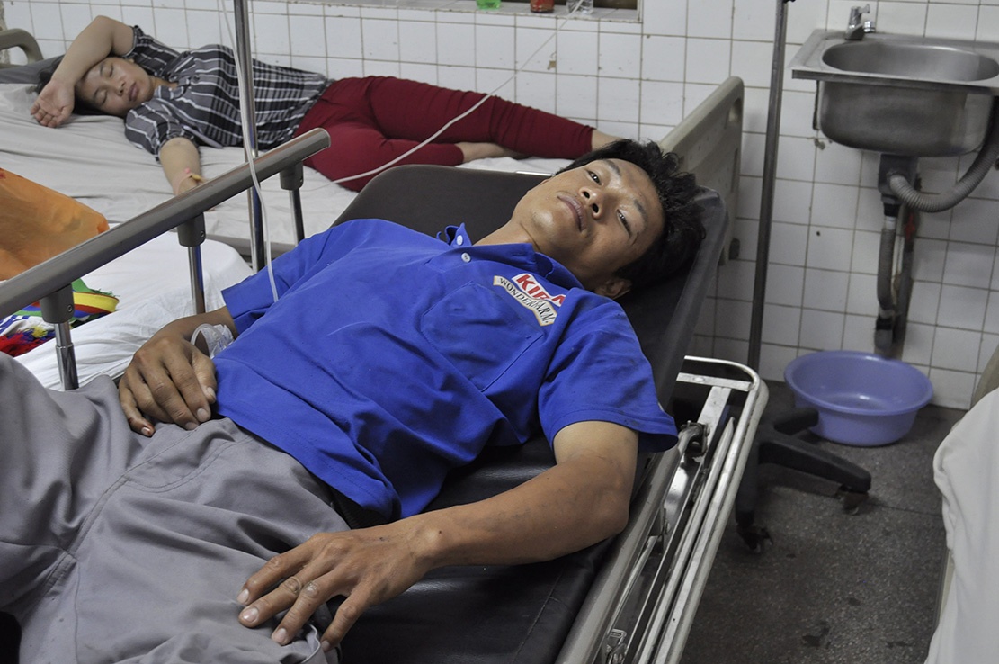 Chiều 6/5, nạn nhân Nguyễn Tân (22 tuổi) và Hà Thế Phong (34 tuổi, cùng ngụ Bình Dương) nằm điều trị tại Khoa cấp cứu, Bệnh viện Đa khoa Bình Dương trong tình trạng chấn thương nặng. Một bác sĩ cho biết, cả hai đã hồi tỉnh song sức khỏe đang suy yếu, tinh thần hoảng loạn. Chân trái của anh Hà Thế Phong không cử động được.