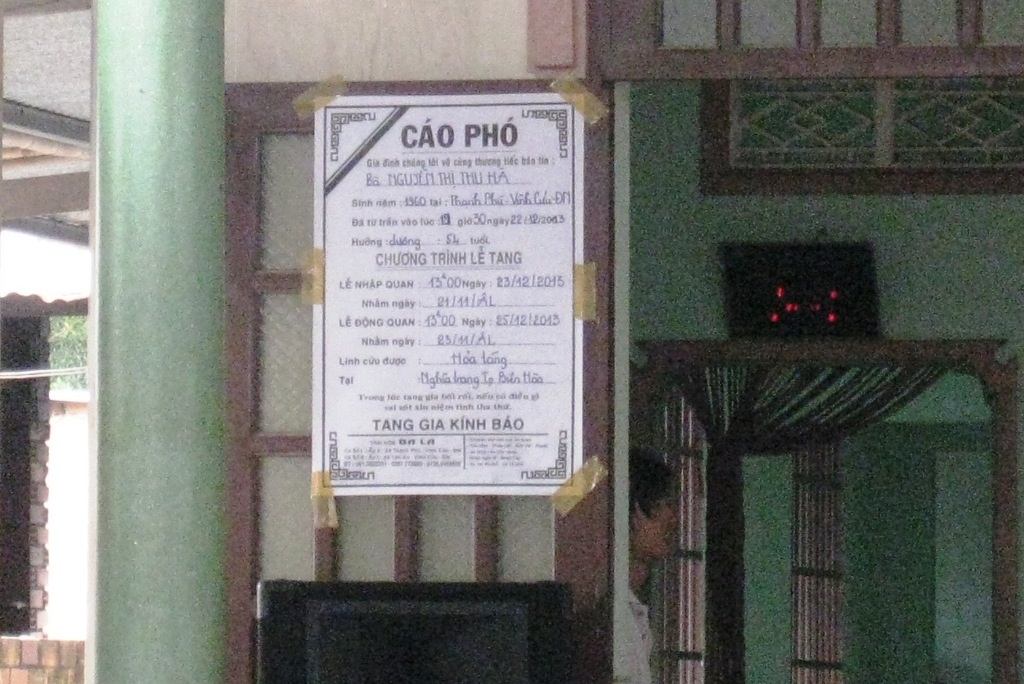 | Bảng cáo phó và đám tang của y tá Nguyễn Thị Thu Hà - một trong năm nạn nhân tử nạn trong vụ hỏa hoạn tại nhà 248 Phan Đình Phùng, P.Trung Dũng, TP.Biên Hòa vào đêm 22/12. |