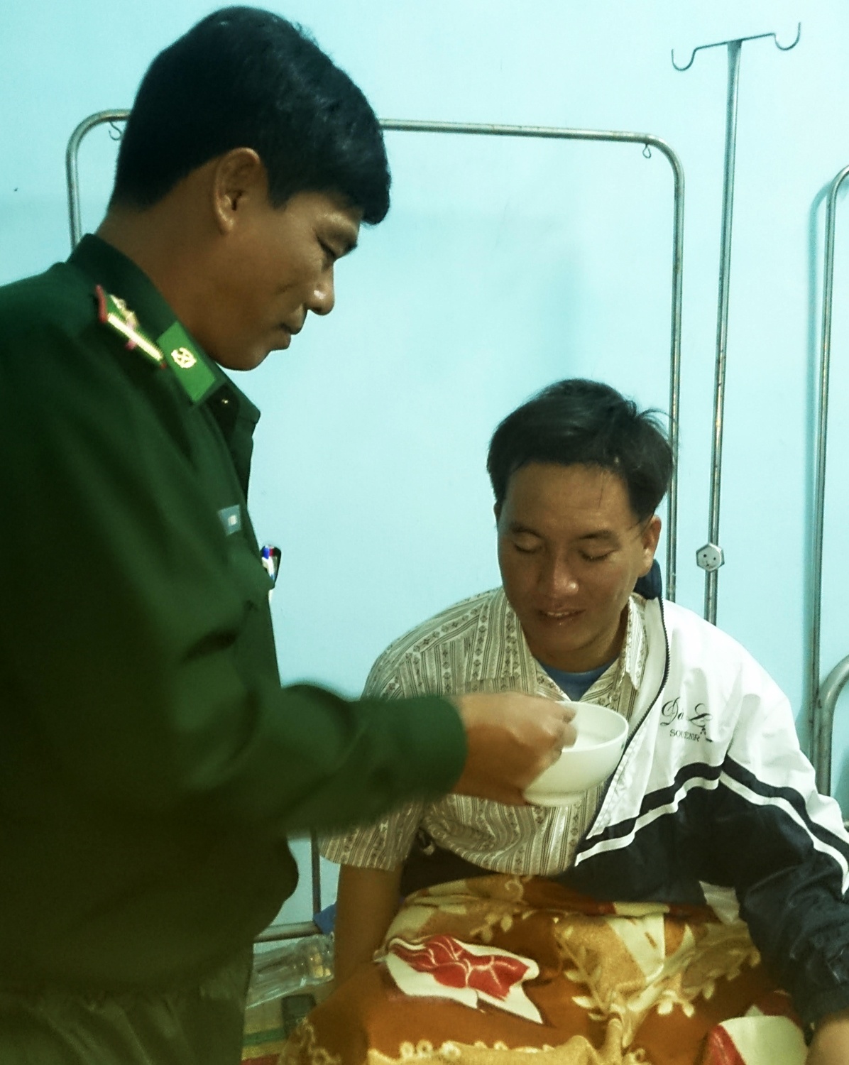 | Bộ đội Biên phòng Đồn Sa Huỳnh cho ngư dân Lộc ăn cháo lấy lại sức sau 21 giờ bị sóng đánh dạt trôi lênh đênh trên biển. Ảnh: M.Hoàng. |