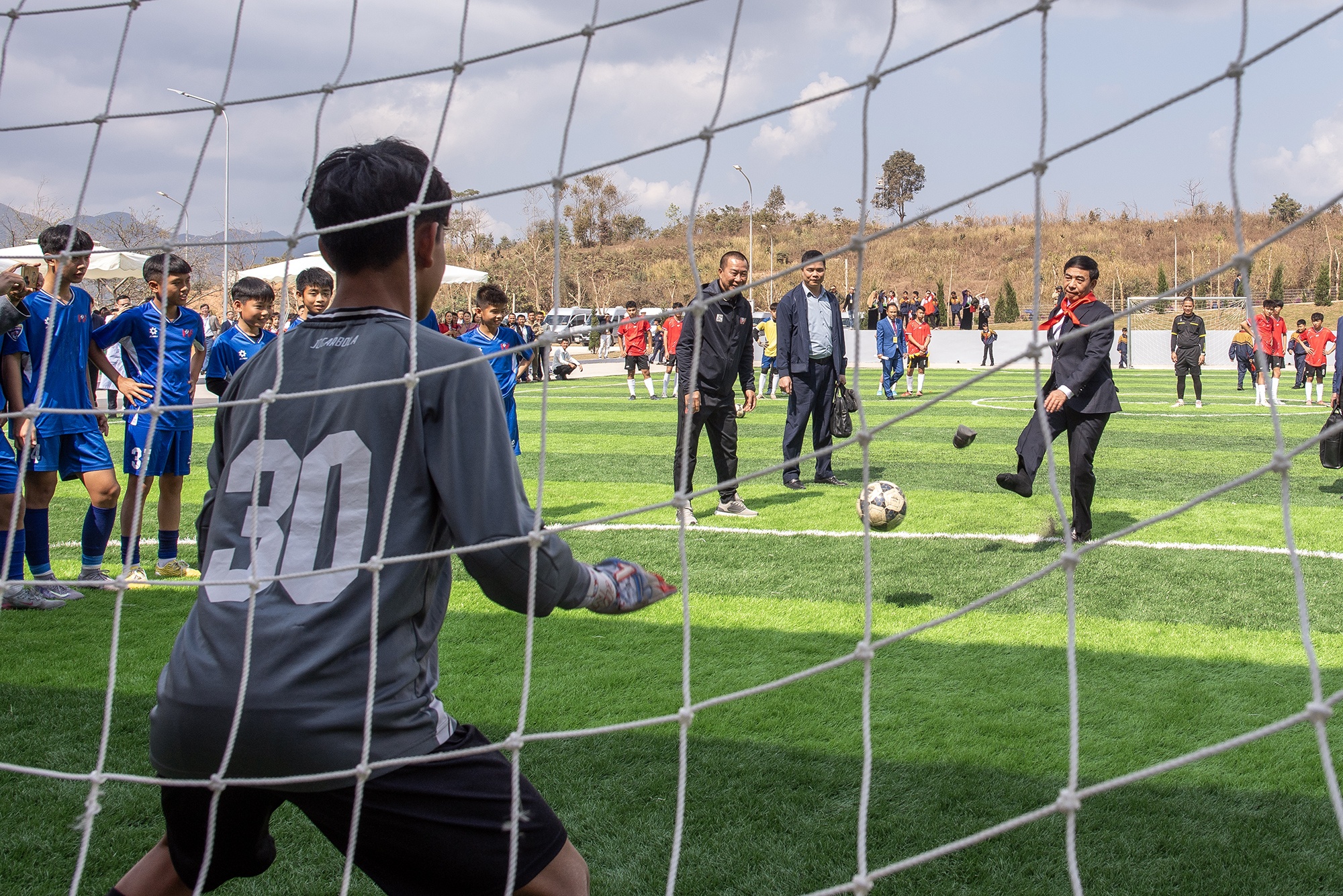 | Bộ trưởng Quốc phòng Phan Văn Giang trổ tài sút luân lưu trong khi Bộ trưởng Công an Lương Tam Quang làm thủ môn. |