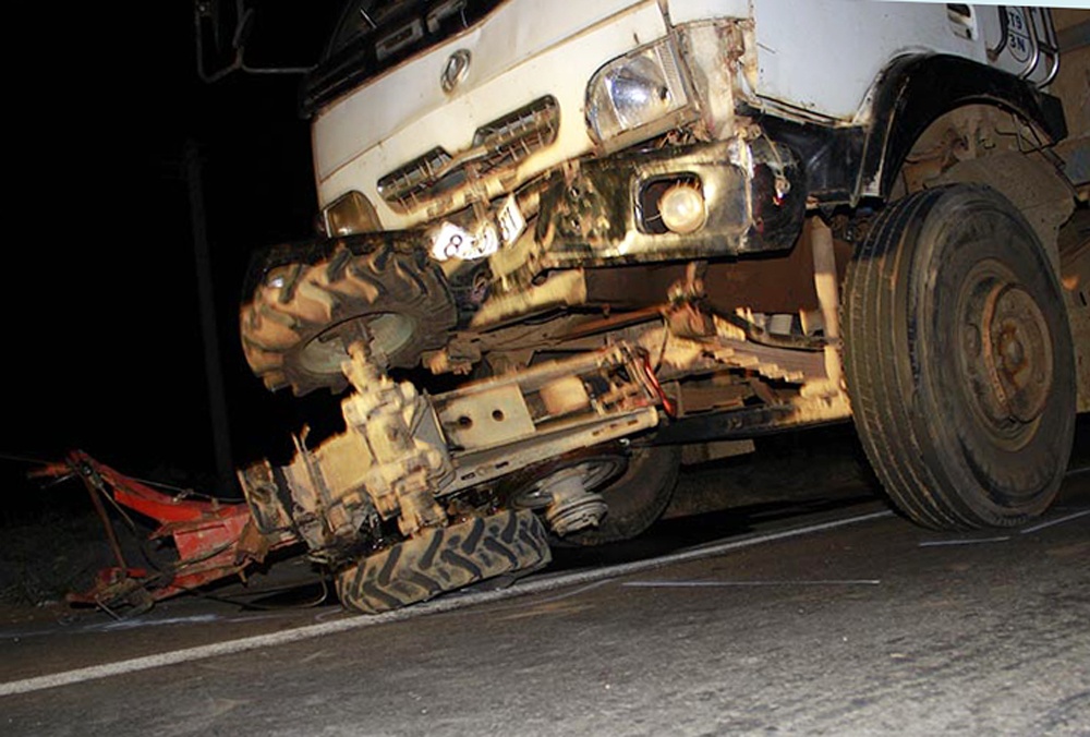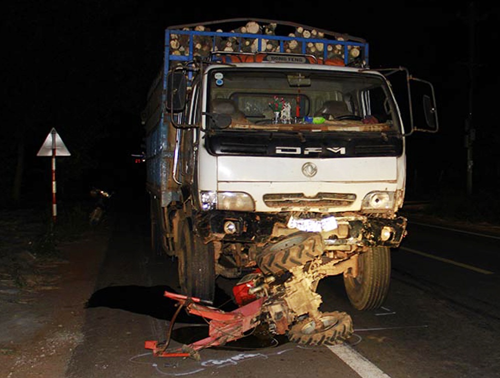 | Ôtô tải húc công nông, kéo lê trên quốc lộ 14. Ảnh: N.Giác. |