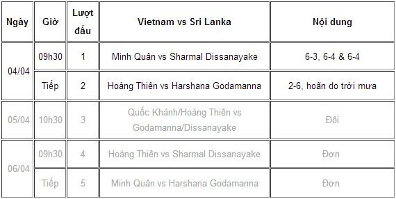 | Lịch thi đấu loạt trận play-off trụ hạng Davis Cup nhóm 2 châu Á - Thái Bình Dương giữa Việt Nam và Sri Lanka. |