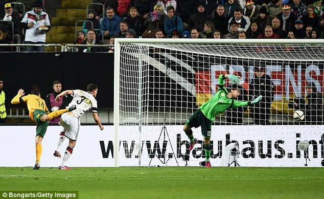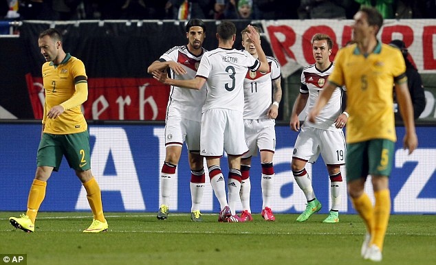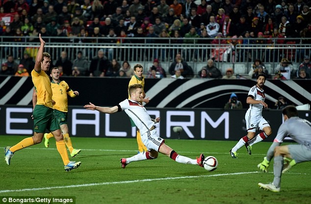 | Phút 81, tiền đạo Lukas Podolski tận dụng đường chuyền của Schuerrle để ghi bàn ấn định tỷ số 2-2 cho tuyển Đức trong trận giao hữu với Australia. |