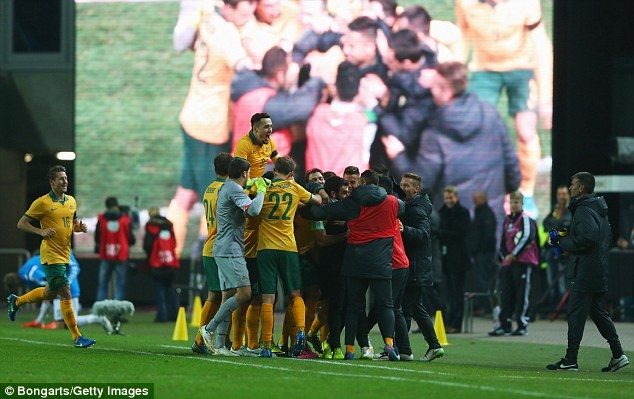 | Niềm vui của các cầu thủ và ban lãnh đạo Australia sau khi vượt lên dẫn trước nhà đương kim vô địch thế giới. |