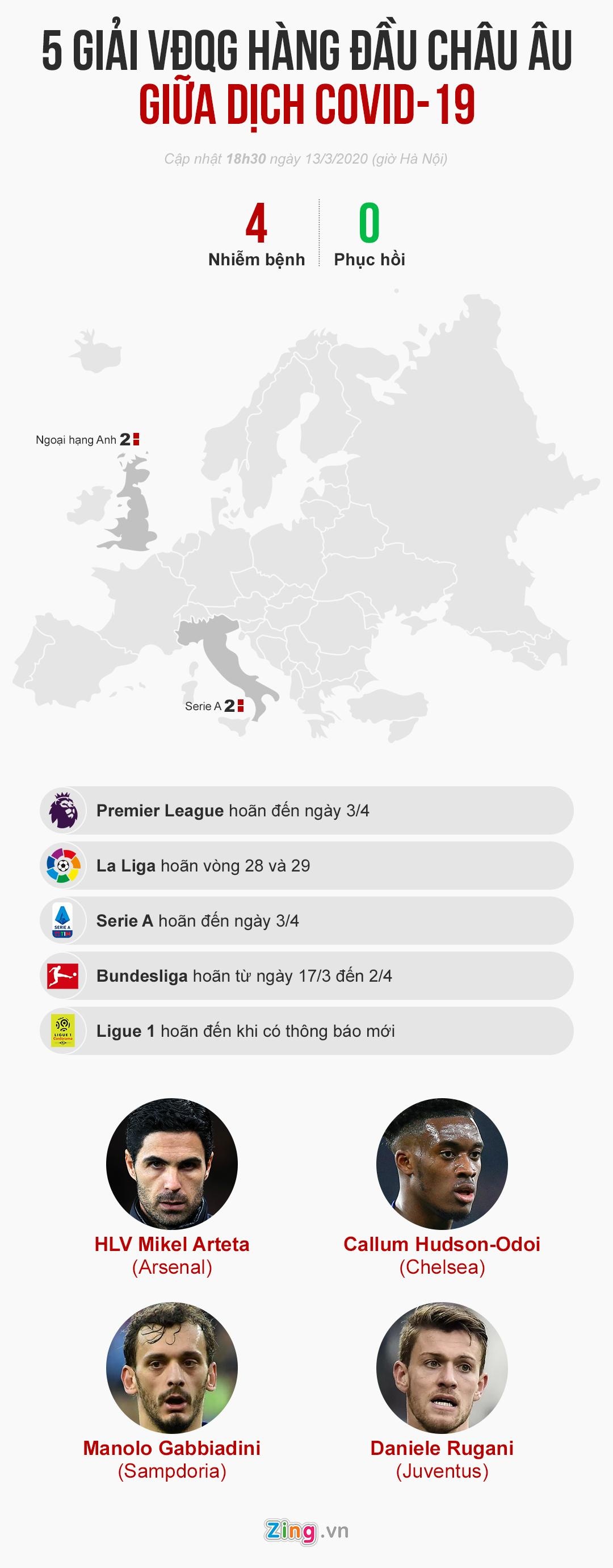 - La Liga, Serie A, Ligue 1, Bundesliga, Eredivisie hoãn thi đấu vì Covid-19.
