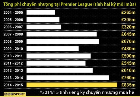 Tổng chi tiêu trong hai kỳ chuyển nhượng mùa 2014/2015 đạt kỷ lục 965 triệu bảng. Rob Wilson, giảng viên trường Đại học Sheffield Hallam nhận định con số đó có thể được phá vỡ ngay ở mùa giải 2015/16.