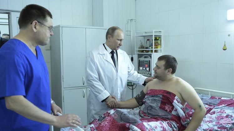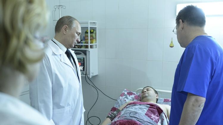 | Ông Putin thăm các nạn nhân của hai vụ đánh bom trong bệnh viện tại thành phố Volgograd. Nhà lãnh đạo Nga tới Volgograd ngay sau khi ông đọc thông điệp đầu năm mới tại thành phố Moscow vào đêm 31/12/2013. Ảnh: RIA Novosti |