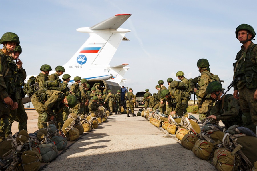 Khoảng 20 máy bay vận tải quân sự Ilyushin Il-76 thả các đơn vị dù xuống chiến trường. Các nhóm chiến thuật di động có nhiệm vụ hỗ trợ đơn vị nhảy dù khi họ tiếp đất. Ảnh: Russian Defense Ministry