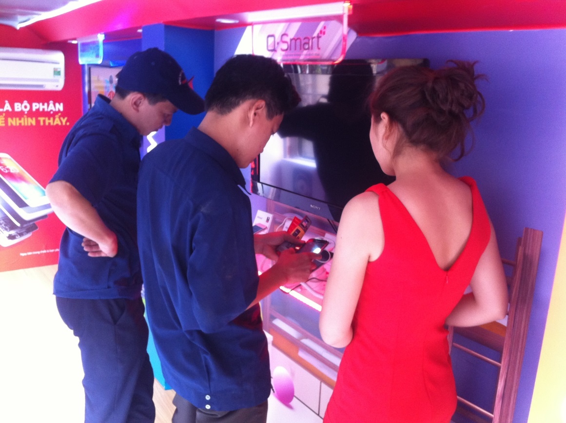 | Công nhân trải nghiệm điện thoại Q-Smart. |