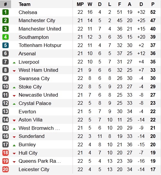 Với 3 điểm giành được từ tay QPR, M.U tạm thời trở lại Top 3 với 40 điểm sau 22 vòng đấu, nhiều hơn đội đứng thứ 4 Southampton 1 điểm nhưng chơi nhiều hơn 1 trận. Trong khi đó, QPR tiếp tục ngụp lặn ở khu vực cầm đèn đỏ (thứ 19) với 19 điểm trong tay.