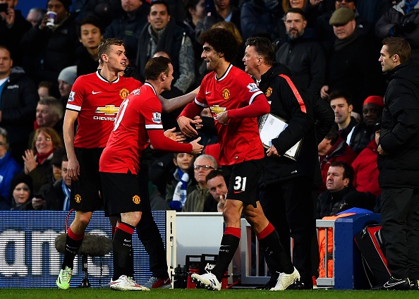 HLV Van Gaal và thành viên BHL M.U đứng bật dậy sau pha dứt điểm của Fellaini. Ảnh: Getty.