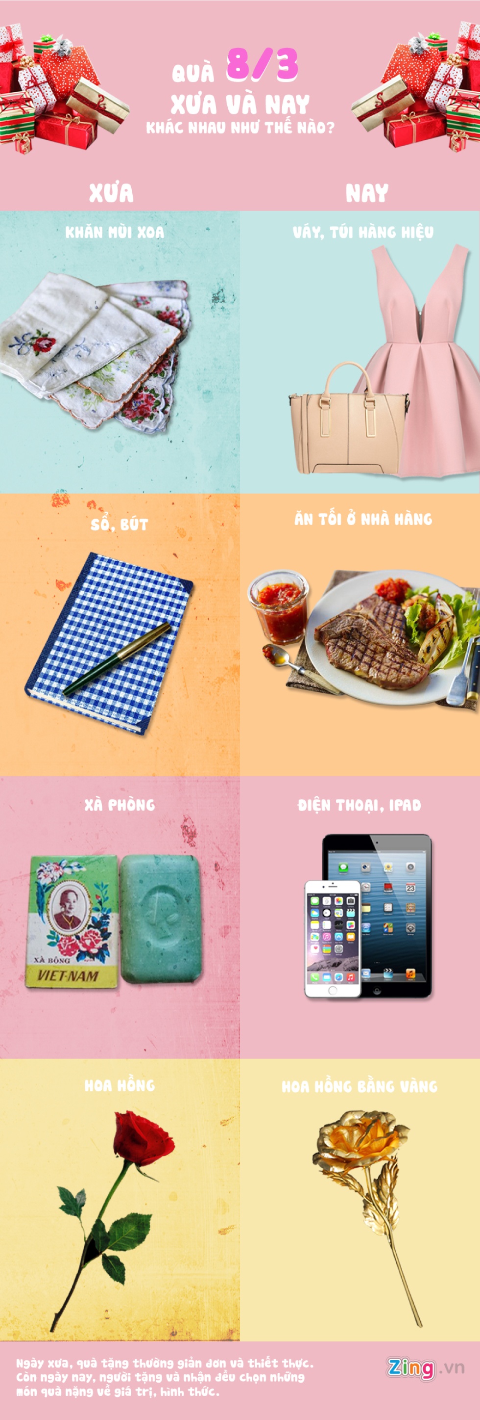 Thay vì những món quà bình dị như khăn tay, sổ, bút, xà phòng, hoa hồng..., ngày nay, dịp 8/3, xu hướng quà tặng thay đổi theo hướng hiện đại là hoa dát vàng, iPhone, hàng hiệu.