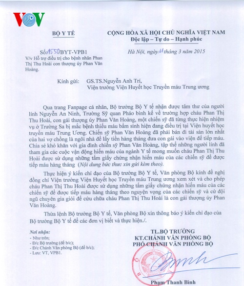 Bộ trưởng Bộ Y tế đã chỉ đạo Văn phòng Bộ có công văn đề nghị Viện Huyết học Truyền Máu Trung ương cho phép cháu Phan Thu Hoài được sử dụng những tấm giấy chứng nhận hiến máu của các chiến sĩ để được tiếp máu hàng tháng; đồng thời đề nghị Viện cử đội ngũ chuyên gia giỏi để cứu chữa cho cháu.