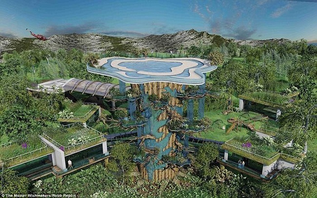 | Ngôi nhà cây với thiết kế độc đáo gồm bể bơi, sông lười, đường băng lên thẳng, thang máy vận hành bằng sức nước có giá 62 triệu USD nằm trong danh sách quà Noel dành cho tỷ phú của tạp chí hàng hiệu Robb Report. |