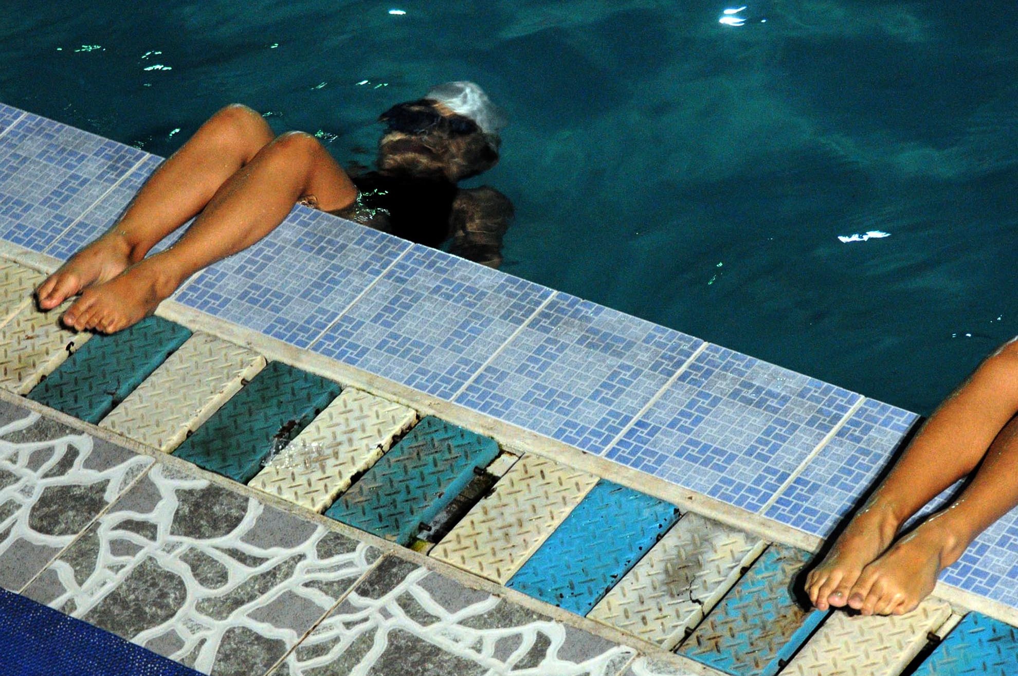 Huỳnh Vũ Nhu Giang (7 tuổi, ngụ quận 8) là vận động viên thuộc lớp nhỏ của đội bơi nghệ thuật đoàn TP.HCM. Giang được sự giúp đỡ của cô giáo để khởi động với bài gập chân trước khi tập luyện. |